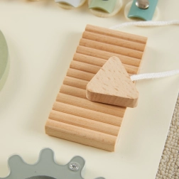 Ξυλόφωνο, γρανάζια, λαβύρινθος, συρόμενα και ανοιγόμενα στοιχεία, χάντρες και πορτάκια με έκπληξη – όλα παρακινούν τα παιδιά να εξερευνούν και αναπτύσσουν τη λεπτή κινητικότητα και τη λογική.