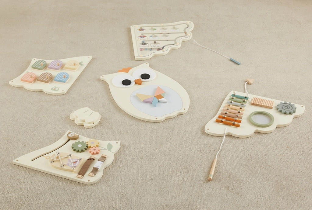 Η σχεδιαστική κουκουβάγια με απλωμένα φτερά προσφέρει στα παιδιά παιχνιδιάρικη εξερεύνηση: ξυλόφωνο, οδοντωτούς τροχούς, συρόμενα και ανοιγόμενα στοιχεία, λαβύρινθο, χάντρες, πορτάκια με απτική έκπληξη και μαγνητικό πίνακα. Οι γενναιόδωρες διαστάσεις ενθαρρύνουν το ομαδικό παιχνίδι περισσοτέρων παιδιών και ταυτόχρονα δημιουργούν κομψή διακόσμηση τοίχου.