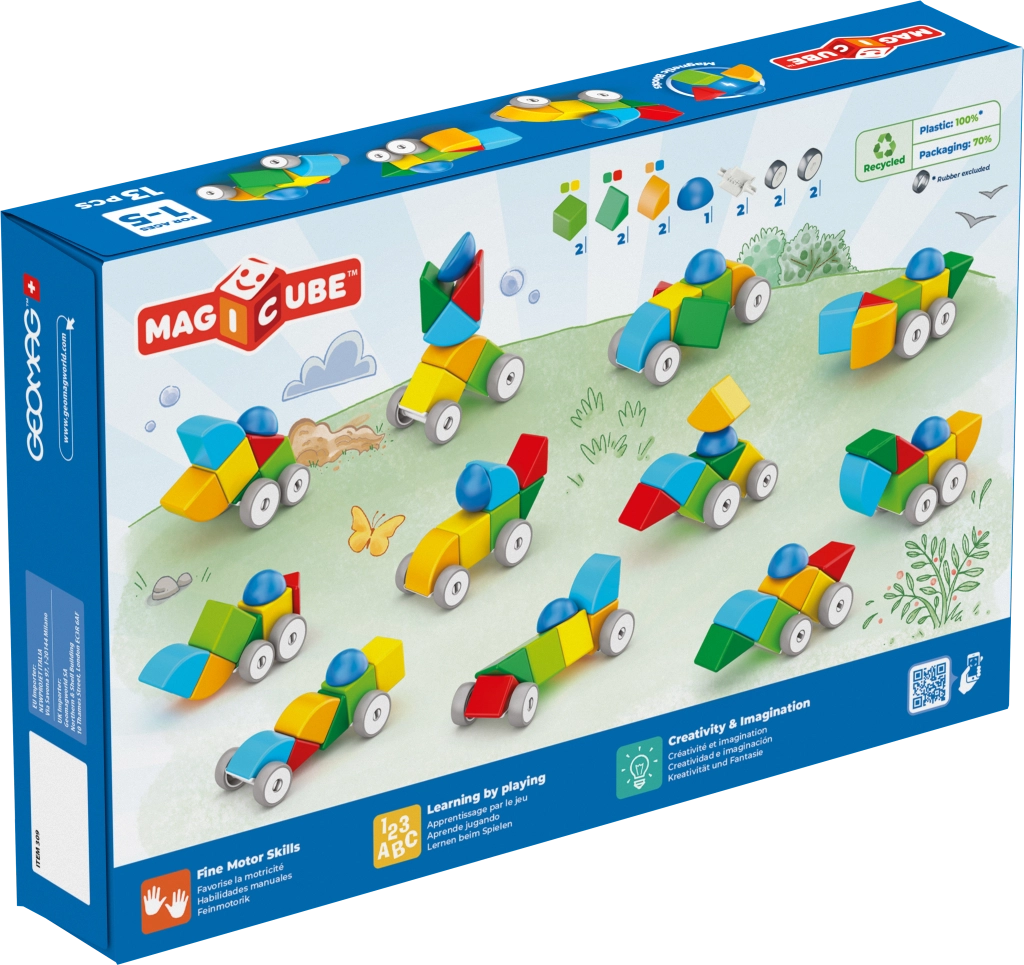 Ανακαλύψτε το διασκεδαστικό μαγνητικό σετ κατασκευών Geomag Magicube με 13 κομμάτια, που αναπτύσσει την δημιουργικότητα, τη λεπτή κινητικότητα και τη λογική σκέψη των παιδιών από 1 έτους. Το σετ από ανακυκλωμένο πλαστικό περιλαμβάνει μαγνητικά σχήματα και τροχούς με σασί για την κατασκευή πολύχρωμων αυτοκινήτων και άλλων δημιουργιών.