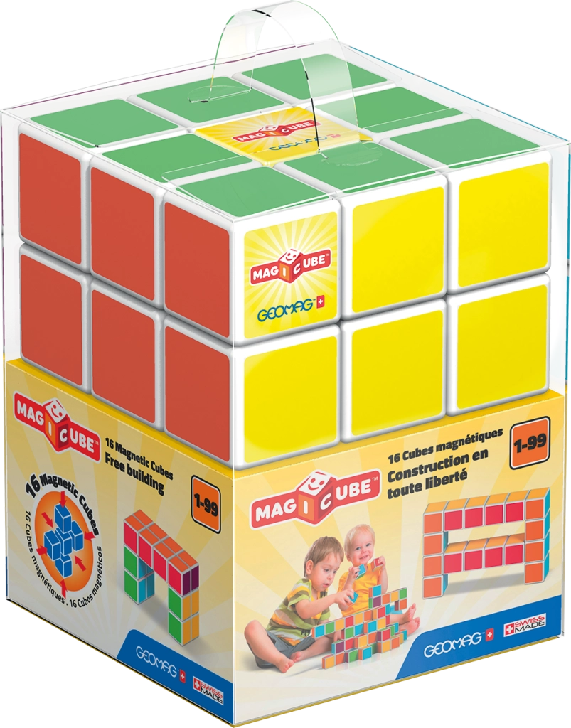 Ανακαλύψτε τη μαγεία των μαγνητικών κατασκευών με το Geomag Magicube. Το καινοτόμο σύστημα επιτρέπει στους κύβους να έλκονται από όλες τις πλευρές, ώστε τα παιδιά να χτίζουν εύκολα πύργους, σχήματα και απλά μοτίβα. Οι πολύχρωμες πλευρές ενισχύουν την οπτική αντίληψη και τη μάθηση χρωμάτων, ενώ ο χειρισμός των κύβων αναπτύσσει τον συντονισμό χεριού–ματιού.
