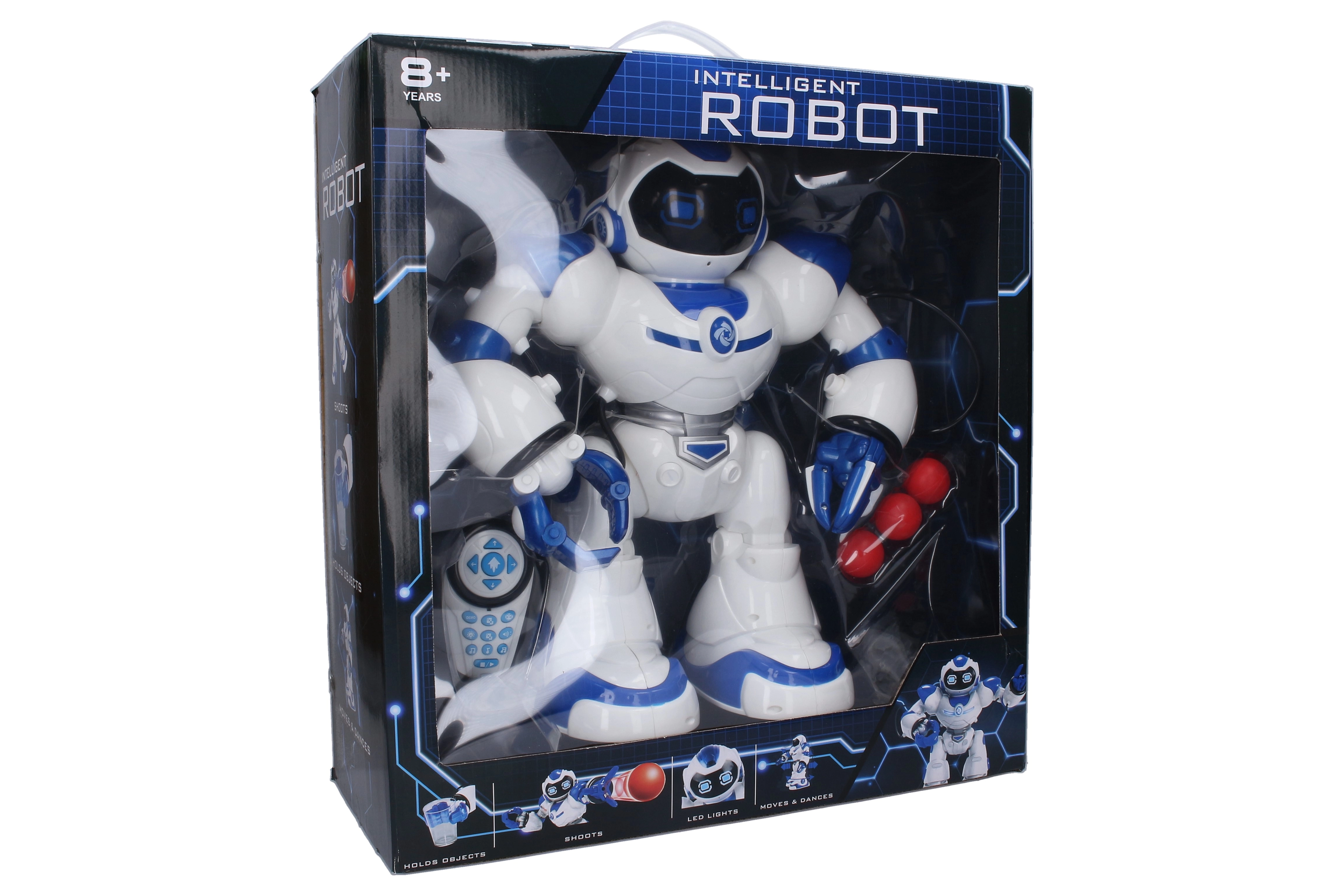 Διασκεδαστικό και διαδραστικό τηλεκατευθυνόμενο ρομπότ (RC) ύψους 40 cm, που εκτοξεύει μπαλάκια, φωτίζει, παίζει μουσική και χορεύει. Προσφέρει προγραμματισμό κινήσεων, υπέρυθρο έλεγχο, ρύθμιση έντασης και πλούσια φωτεινά και ηχητικά εφέ. Στη συσκευασία περιλαμβάνονται 3 μπαλάκια.