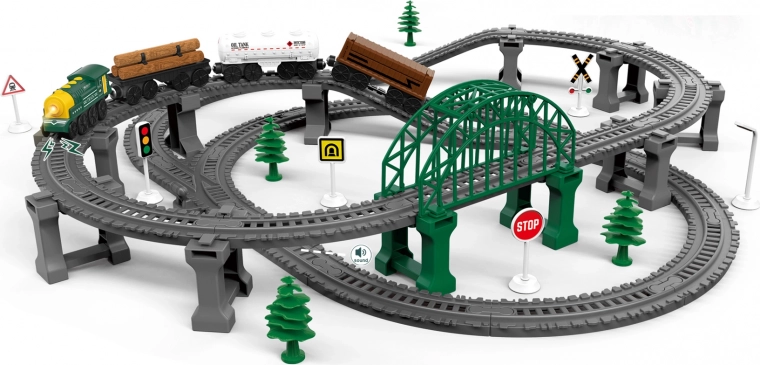 Αυτό το σετ τρένου προσφέρει στα παιδιά ώρες δημιουργικής διασκέδασης. Χάρη στα μαγνητικά συνδεδεμένα βαγόνια, ο χειρισμός είναι εύκολος και ασφαλής. Στη μηχανή θα βρείτε πρακτικά πλήκτρα ελέγχου – το μεσαίο λειτουργεί ως ON/OFF, ενώ με τα πλαϊνά πλήκτρα καθορίζετε την κατεύθυνση κίνησης. Ειδικό τμήμα της γραμμής ενεργοποιεί ηχητικά εφέ, που προσδίδουν αυθεντικότητα στη διαδρομή.