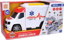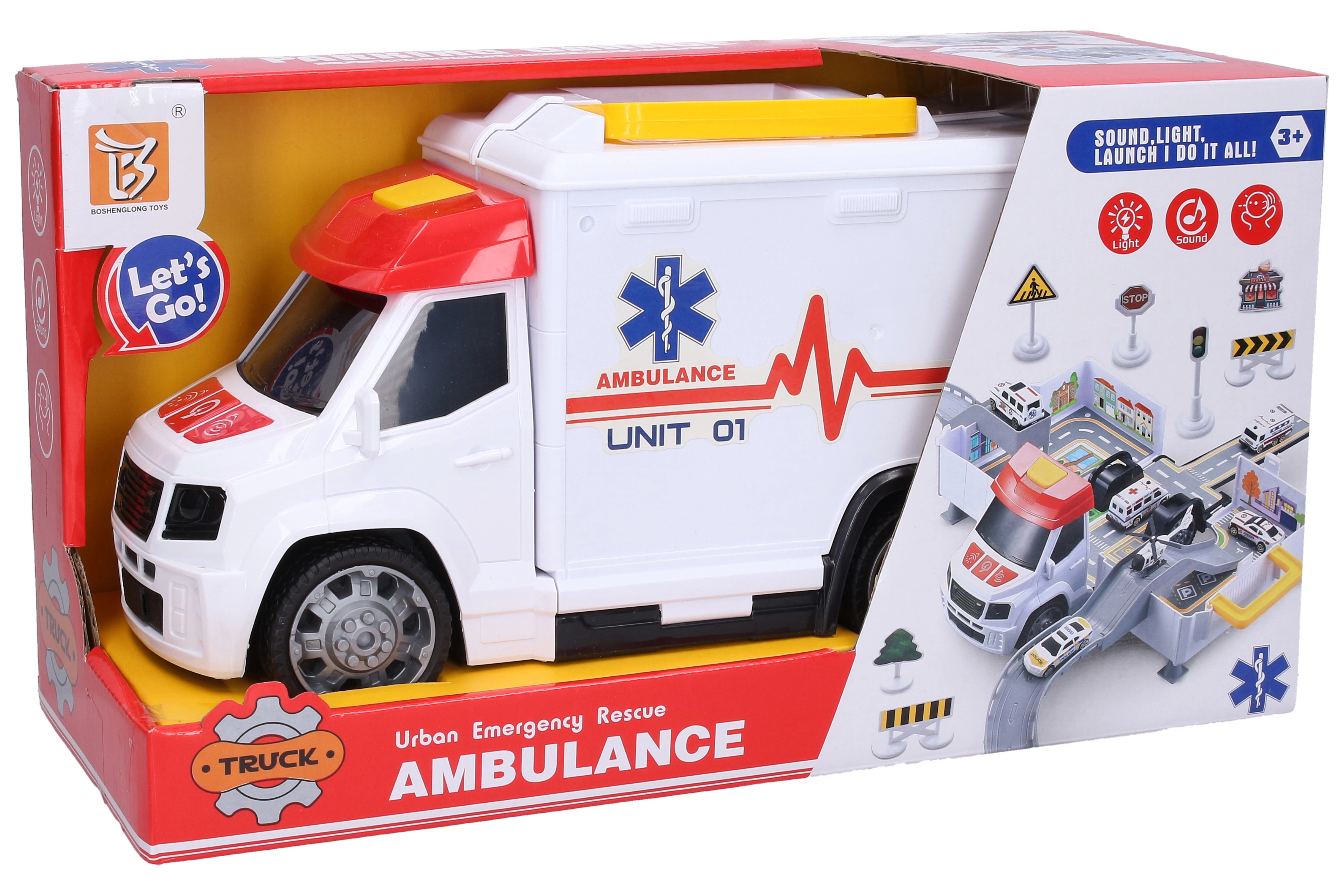 Διασκεδαστικό και ρεαλιστικό ασθενοφόρο με αναδιπλούμενο γκαράζ νοσοκομείου που προσφέρει στα παιδιά ώρες παιχνιδιού. Διαθέτει φωτεινά και ηχητικά εφέ, ενεργοποίηση με κουμπιά στο καπό και μεγάλο κουμπί στην οροφή για ξεκλείδωμα. Περιλαμβάνεται τροφοδοσία 3× AG13. Οι ελεύθεροι τροχοί εξασφαλίζουν ομαλή κίνηση και όταν ανοίξει, δημιουργείται χώρος παιχνιδιού νοσοκομείου με αυτοκινητάκια και πινακίδες.