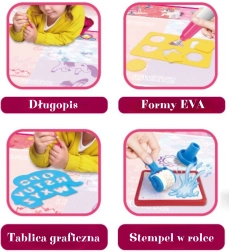 Χάρη στη μεγάλη επιφάνεια 98 × 78 cm, στο χαλάκι μπορούν να διασκεδάσουν άνετα ένα ή περισσότερα παιδιά. Διπλώνεται εύκολα, κάτι που θα εκτιμήσετε στο σπίτι και στα ταξίδια. Στη συσκευασία περιλαμβάνονται επίσης στένσιλ, σφραγίδες και πολύχρωμα καλουπάκια, που επεκτείνουν τις δυνατότητες δημιουργίας και ενθαρρύνουν την αναγνώριση χρωμάτων και σχημάτων.