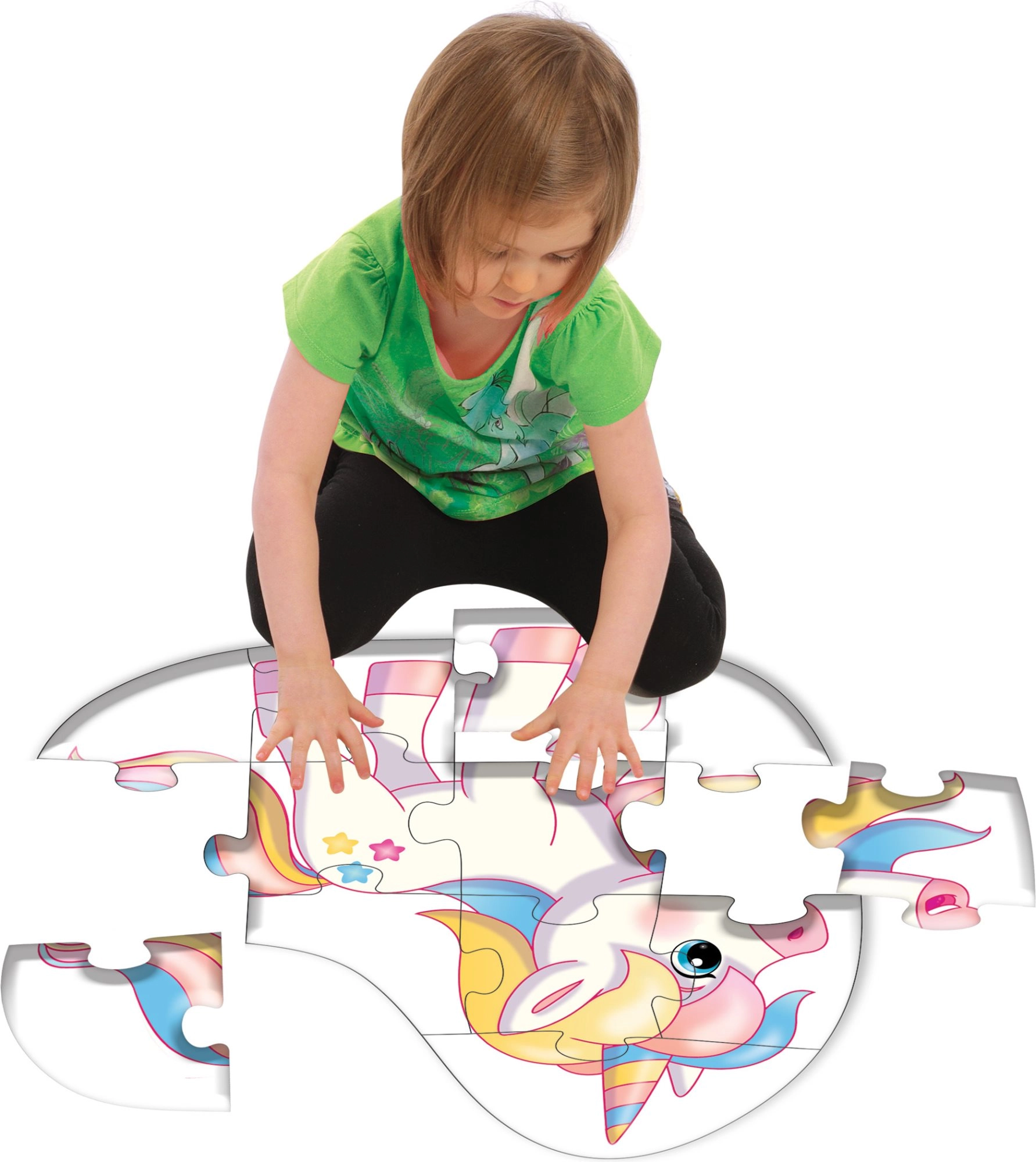 Αυτό το παζλ περιγράμματος σε σχήμα μονόκερου θα ενθουσιάσει όλους τους μικρούς φίλους των παραμυθιών. Η ολοκληρωμένη εικόνα μετρά περίπου 53 × 55 εκ., ώστε να είναι ευανάγνωστη, καθαρή και ιδανική για συναρμολόγηση στο πάτωμα. Τα μεγαλύτερα κομμάτια κρατιούνται άνετα ακόμη και από μικρά παιδιά.