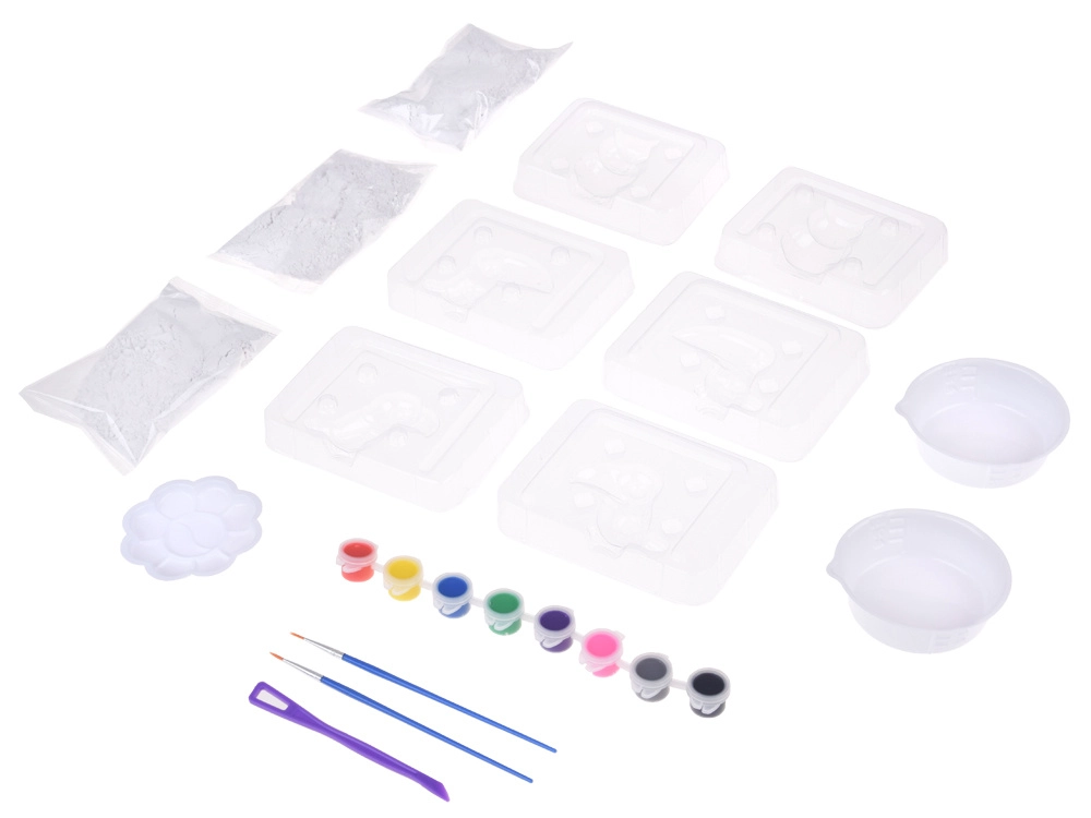 - 3 σακουλάκια γύψου, διάφανα καλούπια για πουλιά, 2 δοσομετρητές, παλέτα ανάμειξης, 8 ακρυλικά χρώματα, 2 πινέλα, πλαστικό εργαλείο/μαχαιράκι