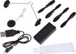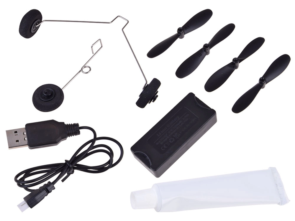 - Αεροπλάνο, 4× έλικας, 2× οριζόντιος σταθεροποιητής, 2× τροχοί, καλώδιο USB, τηλεχειριστήριο, σωληνάριο κόλλας