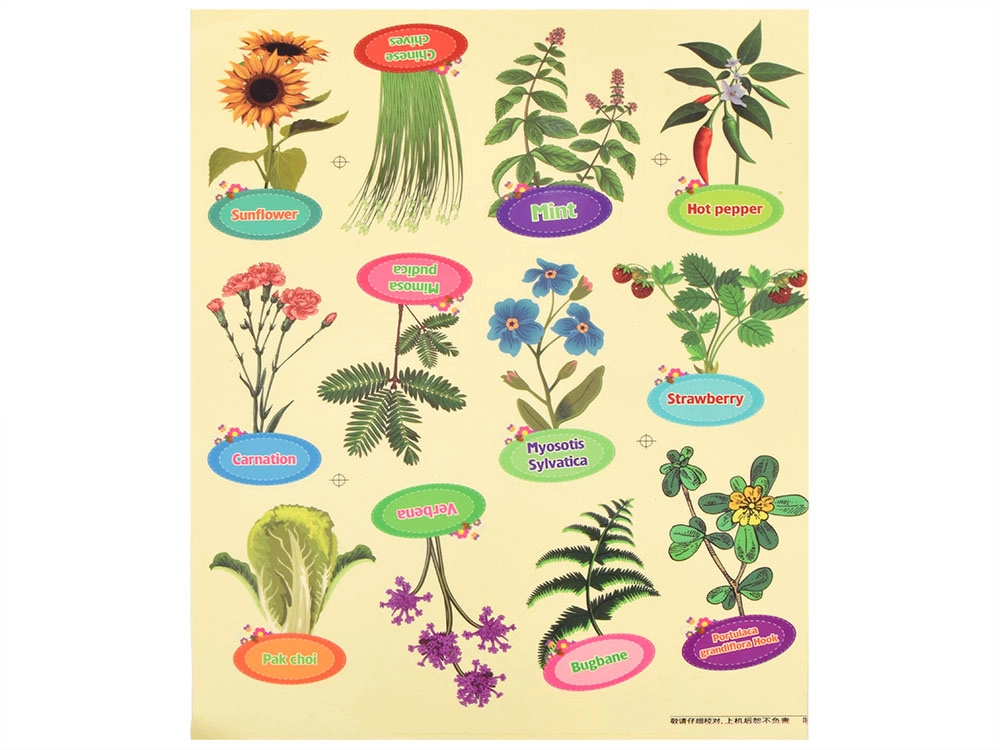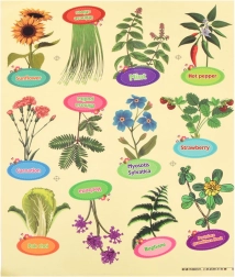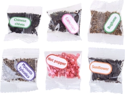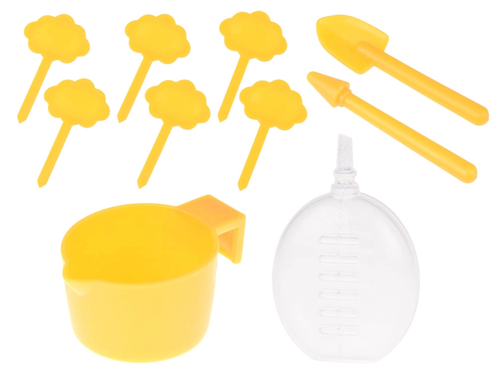 - 1× μίνι θερμοκήπιο, 6× βιοδιασπώμενη γλάστρα, 6× μπρικέτα καρύδας (Ø 30 mm), 6× ετικέτα για επισήμανση φυτών, 1× φτυαράκι, 1× αιχμή σποράς, 1× κυπελλάκι για πότισμα, 1× σετ αυτοκόλλητων (με ονόματα και εικόνες φυτών), 1× σετ αυτοκόλλητων με ονόματα φυτών (στα αγγλικά), 6× σακουλάκι με σπόρους (βάλσαμο/ντελόνι, ηλίανθος, πολυετές, σχοινόπρασο, γαρύφαλλο, πιπεριά), εικονογραφημένες οδηγίες