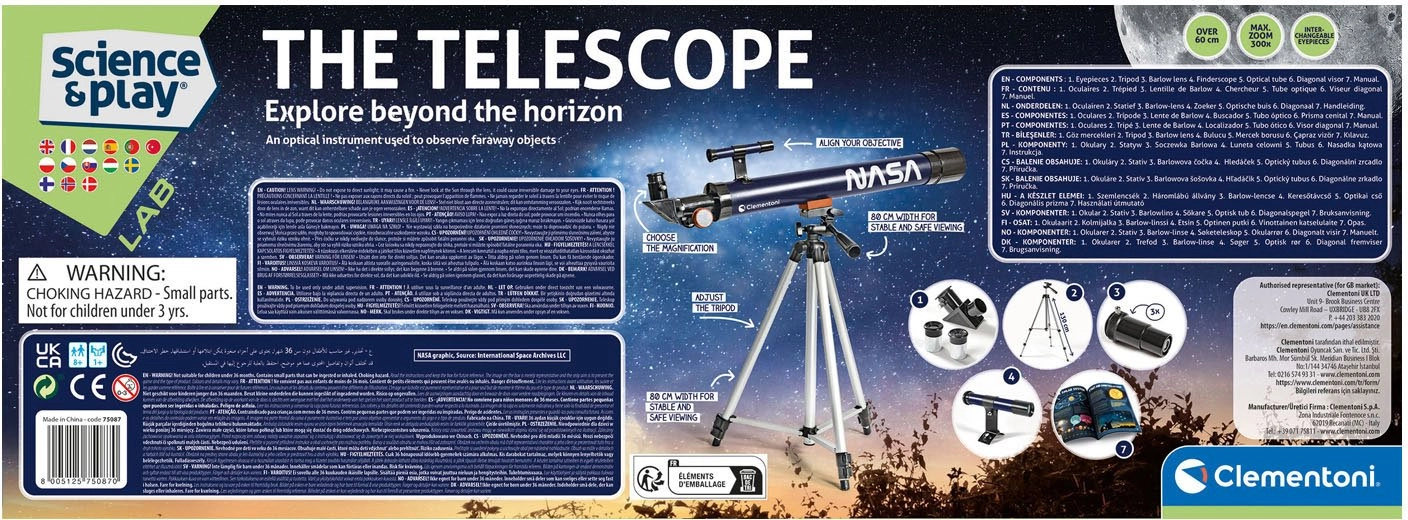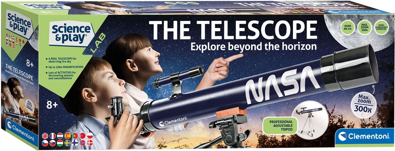 Το παιδικό τηλεσκόπιο CLEMENTONI Science & Play είναι το ιδανικό εισιτήριο στον κόσμο της αστρονομίας. Προσφέρει καθαρή εικόνα χάρη στον αντικειμενικό φακό διαμέτρου 50 mm και τους δύο εναλλάξιμους προσοφθάλμιους (6 mm και 12 mm), με τους οποίους τα παιδιά μπορούν εύκολα να εξερευνήσουν τη Σελήνη, τα άστρα και βασικά αντικείμενα του νυχτερινού ουρανού. Η έμπνευση από τη NASA και η έμφαση στην εκπαίδευση το καθιστούν ιδανική επιλογή για μικρούς εξερευνητές.