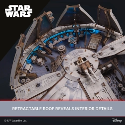 Συναρμολογήστε το εμβληματικό σκάφος από τον γαλαξία του Star Wars – το Millennium Falcon από την Ugears. Αυτό το λεπτομερές 3D μοντέλο σε κλίμακα 1:75 προσφέρει μπλε LED φώτα που προσομοιώνουν τον υπερκινητήρα, ανοιγόμενη οροφή, χώρο φορτίου με ράμπα, κινούμενους πυργίσκους πυροβολικού και κεραία περιστρεφόμενη 360°. Η συναρμολόγηση γίνεται χωρίς κόλλα και εργαλεία και τα χρωματιστά στοιχεία προσδίδουν στο μοντέλο ρεαλιστική εμφάνιση.