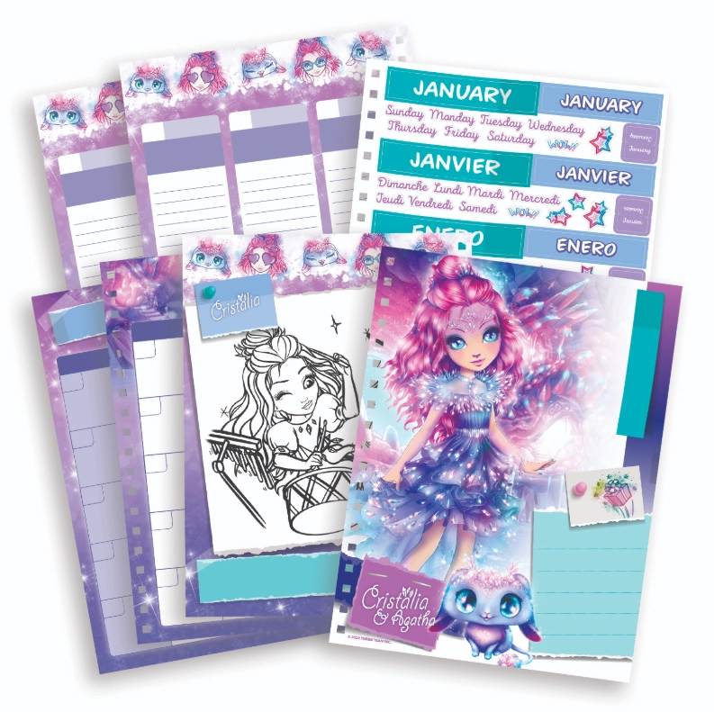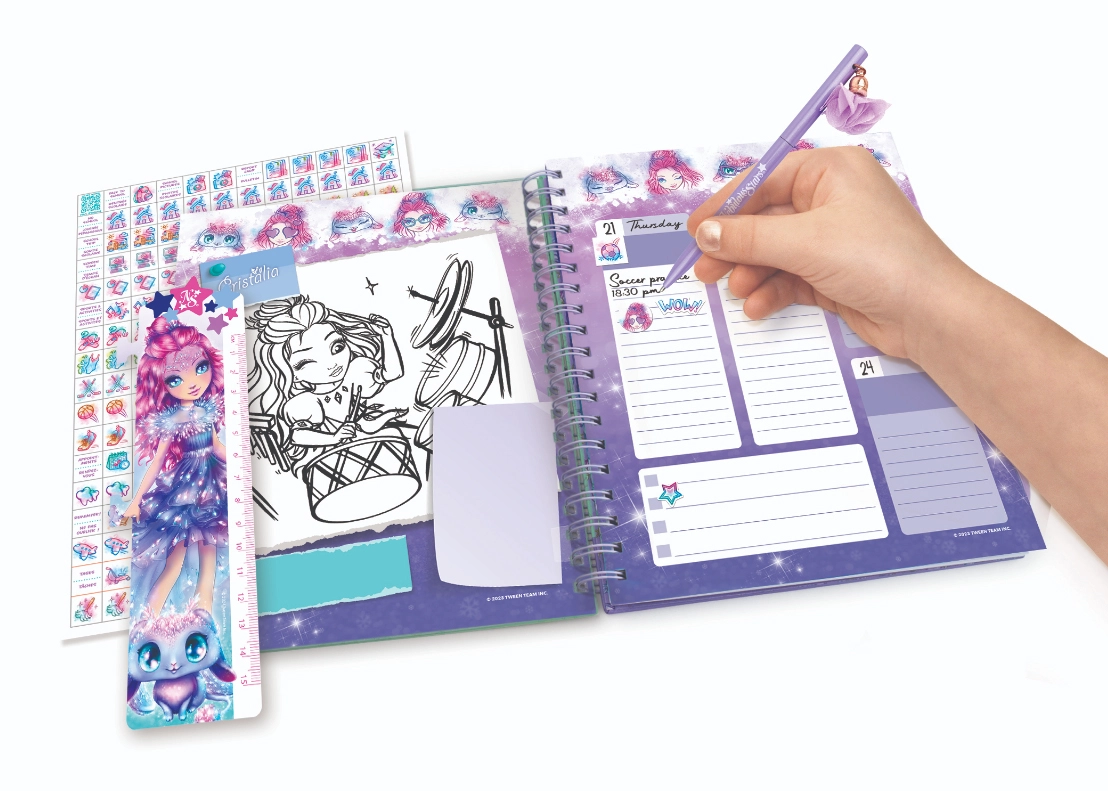 Περιλαμβάνει 1164 αυτοκόλλητα σε τέσσερις γλώσσες· τα ελληνικά αυτοκόλλητα είναι διαθέσιμα για λήψη μέσω QR κωδικού μέσα στο ημερολόγιο. Ο πρακτικός σελιδοδείκτης διευκολύνει τον γρήγορο εντοπισμό της τρέχουσας ημέρας ή εβδομάδας. Η ανθεκτική σπείρα και τα σκληρά εξώφυλλα εξασφαλίζουν μεγάλη διάρκεια ζωής ακόμη και με καθημερινή μεταφορά στο σακίδιο.