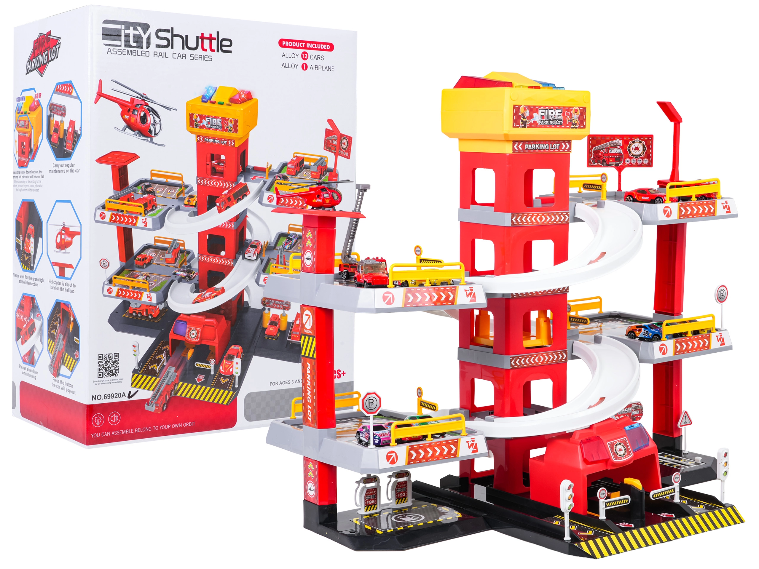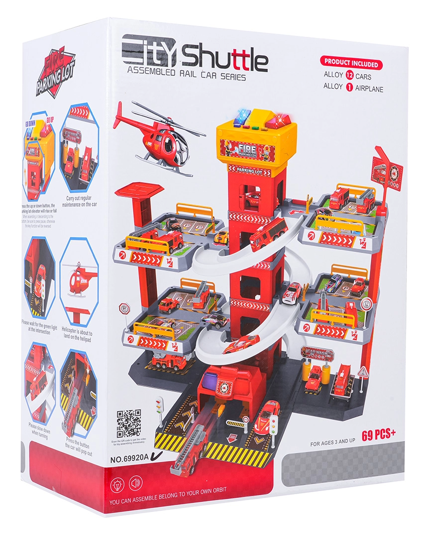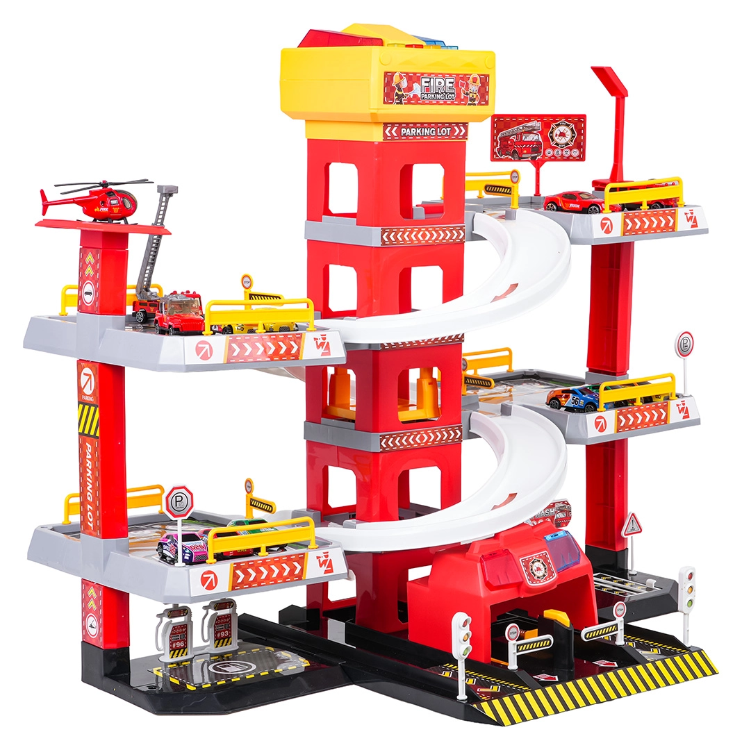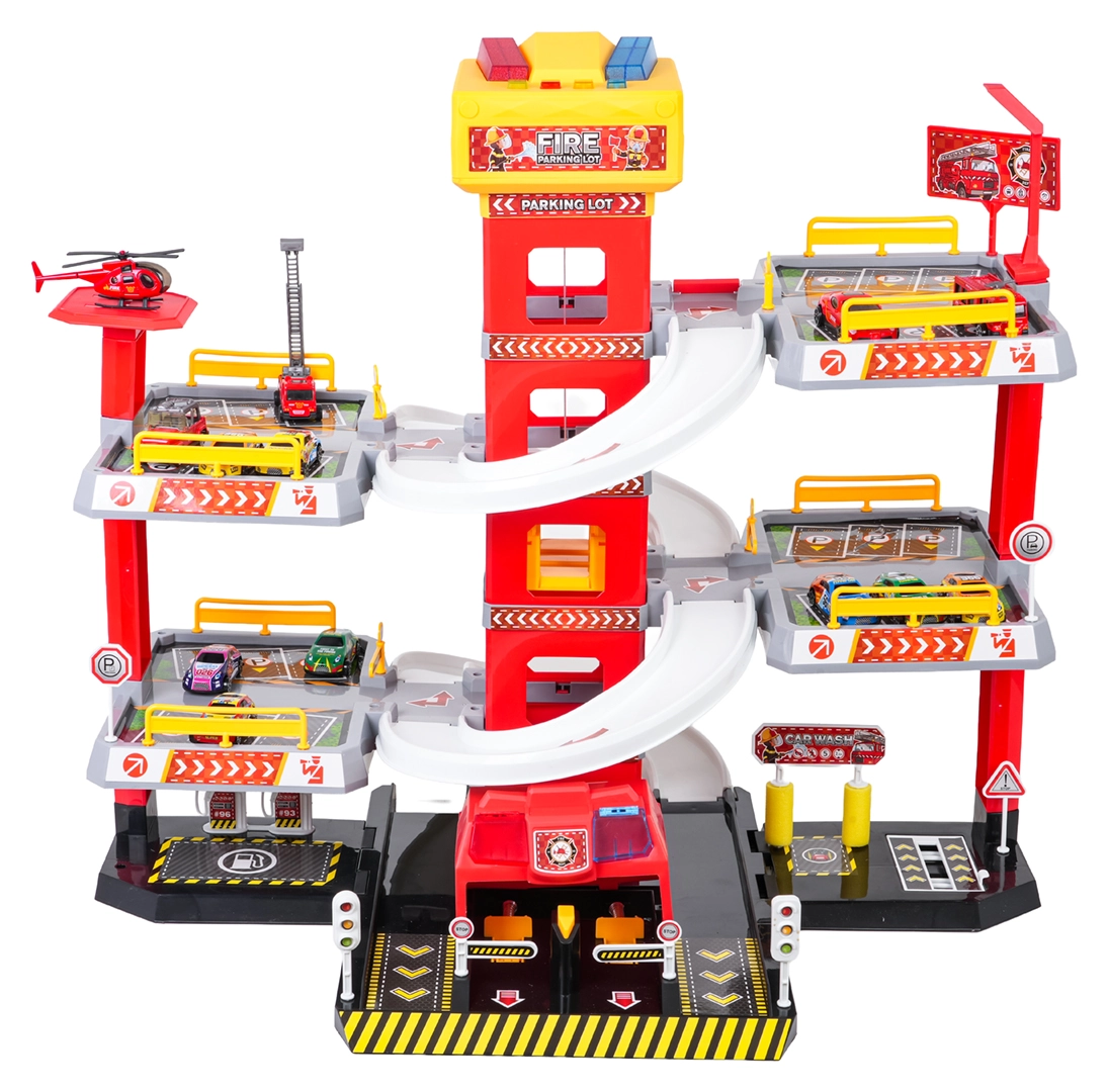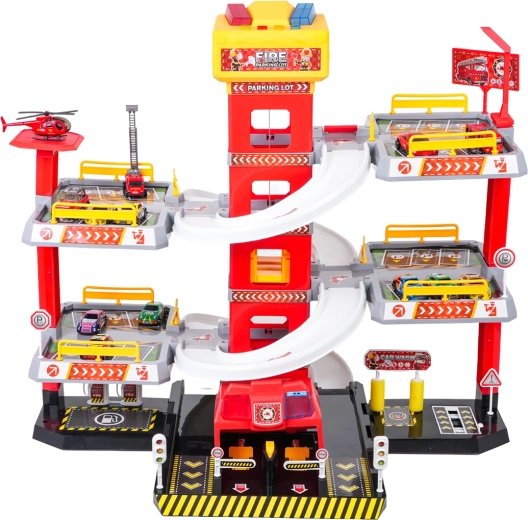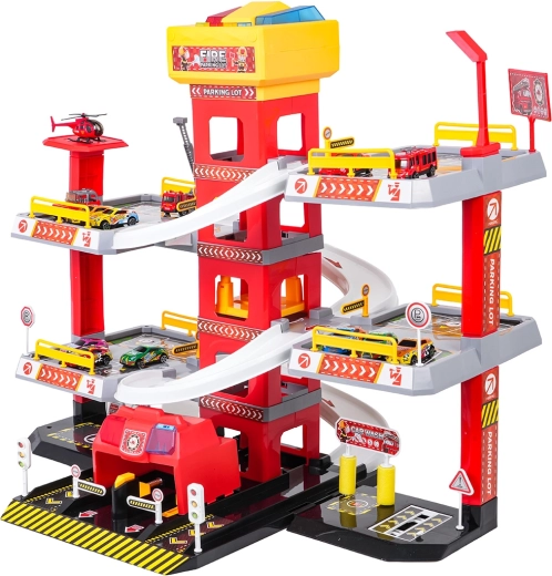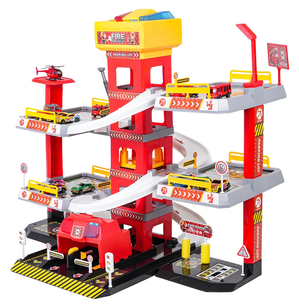 Αυτό το μεγάλο, τριώροφο πυροσβεστικό πάρκινγκ προσφέρει στα παιδιά ρεαλιστικό και δυναμικό παιχνίδι. Χάρη στον κεντρικό πύργο με ασανσέρ, τα αυτοκινητάκια μπορούν να μετακινούνται άνετα μεταξύ των ορόφων ή να «τρέχουν» προς τα κάτω στις καμπύλες ράμπες. Ο επάνω πίνακας του ασανσέρ διαθέτει μεγάλα κουμπιά για έλεγχο πάνω/κάτω και τέσσερα μικρότερα κουμπιά για εφέ – ήχους εκκίνησης, όπισθεν, επιτάχυνσης, φρεναρίσματος και μελωδία, συνοδευόμενα από αναβοσβήνοντα φωτάκια.