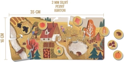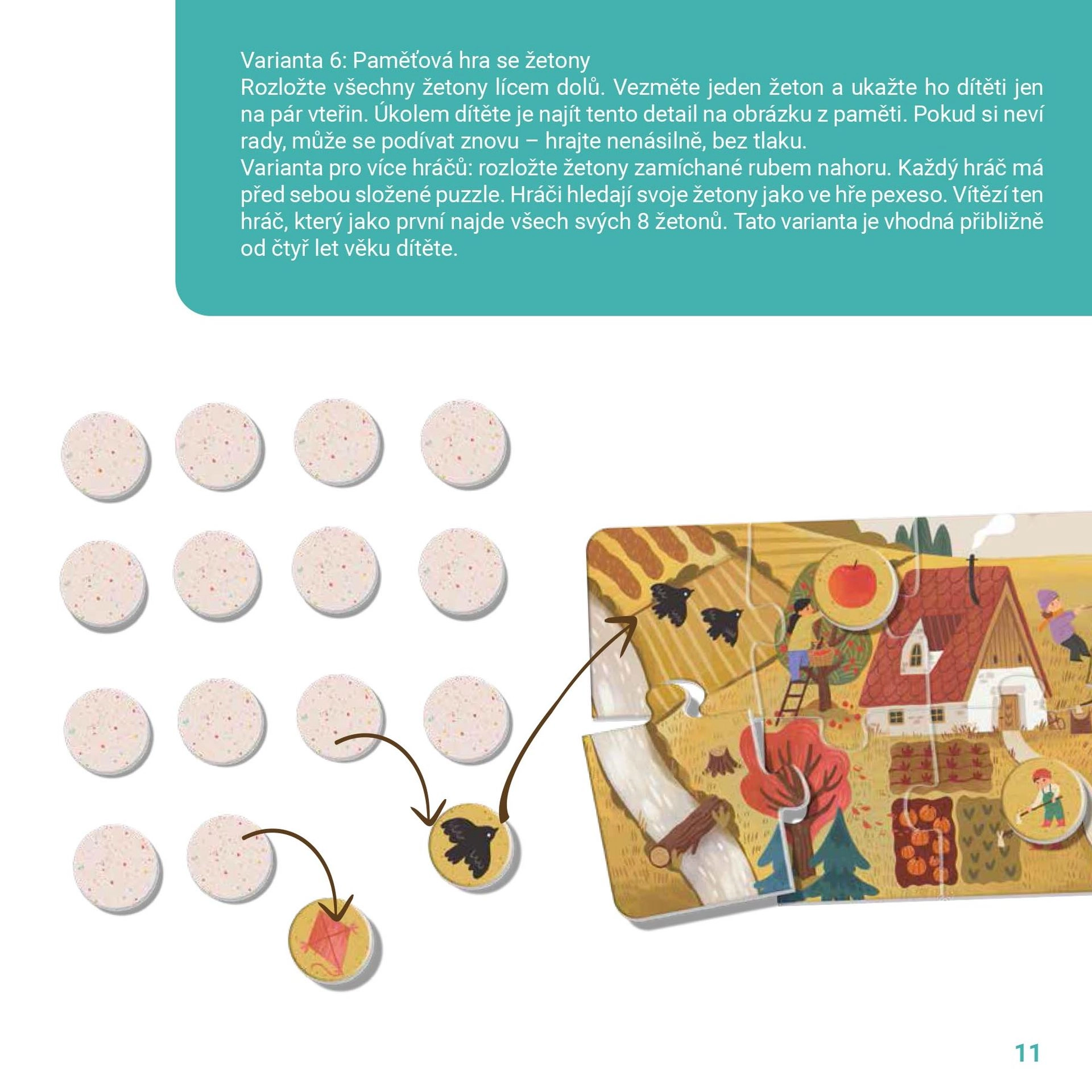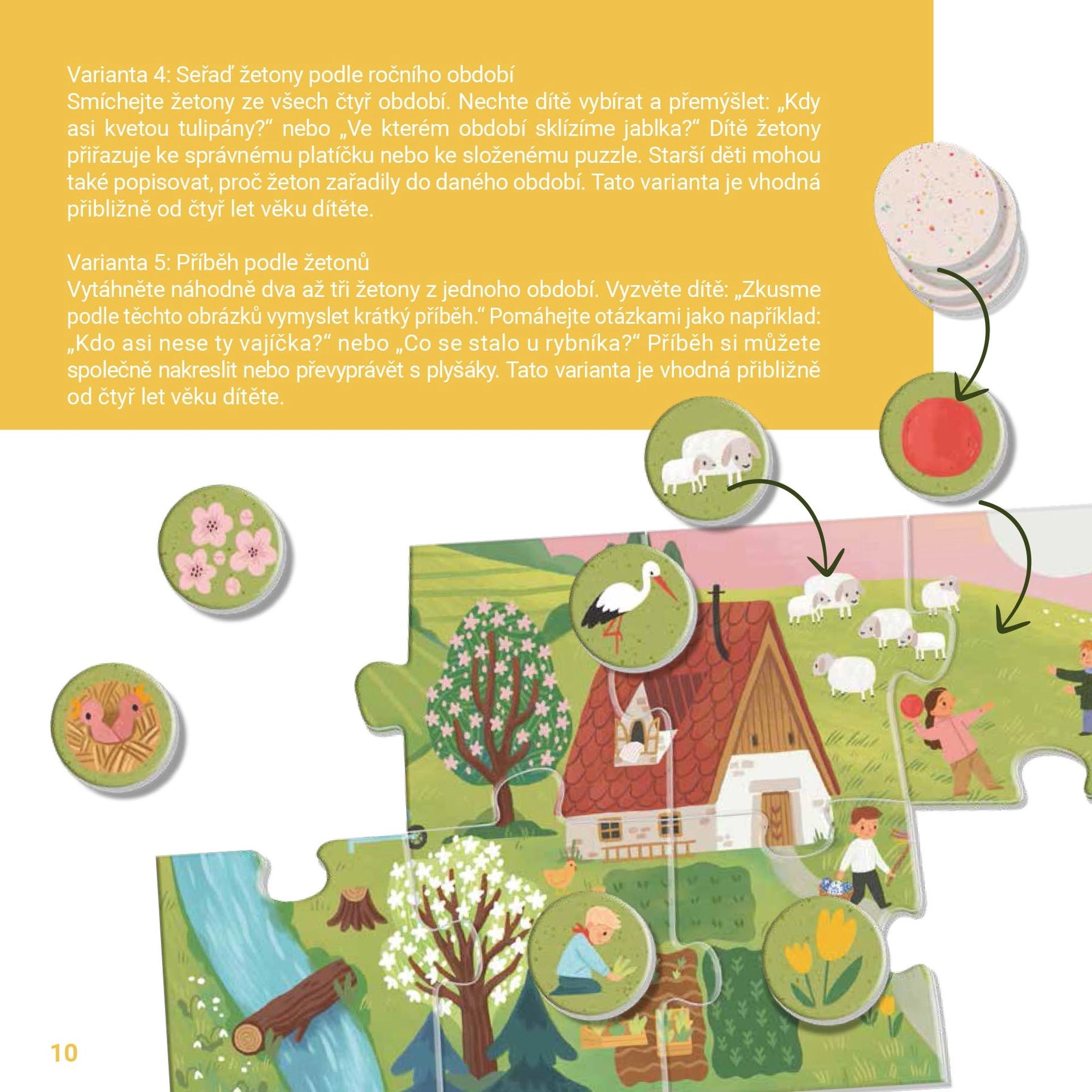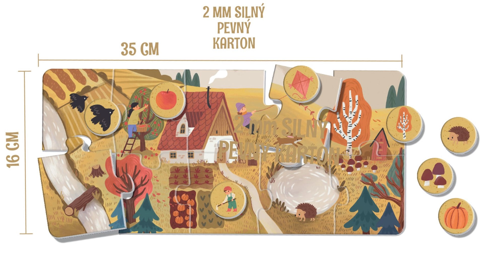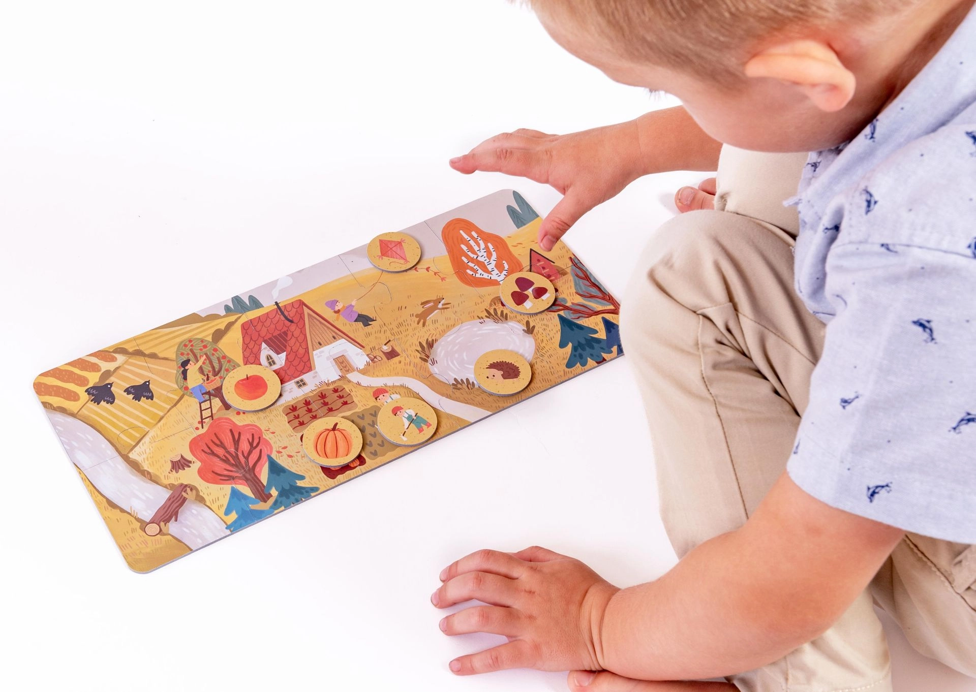 Το παιχνίδι είναι σχεδιασμένο για μικρά χεράκια: τα έξτρα μεγάλα κομμάτια από FSC χαρτόνι 2 mm είναι ανθεκτικά, εύκολα στο κράτημα και εντελώς χωρίς πλαστικό. Η μάθηση γίνεται φυσικά – τα παιδιά εξασκούν την προσοχή, διευρύνουν το λεξιλόγιο και συζητούν για τις αλλαγές στη φύση κατά τη διάρκεια του έτους.