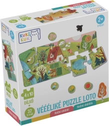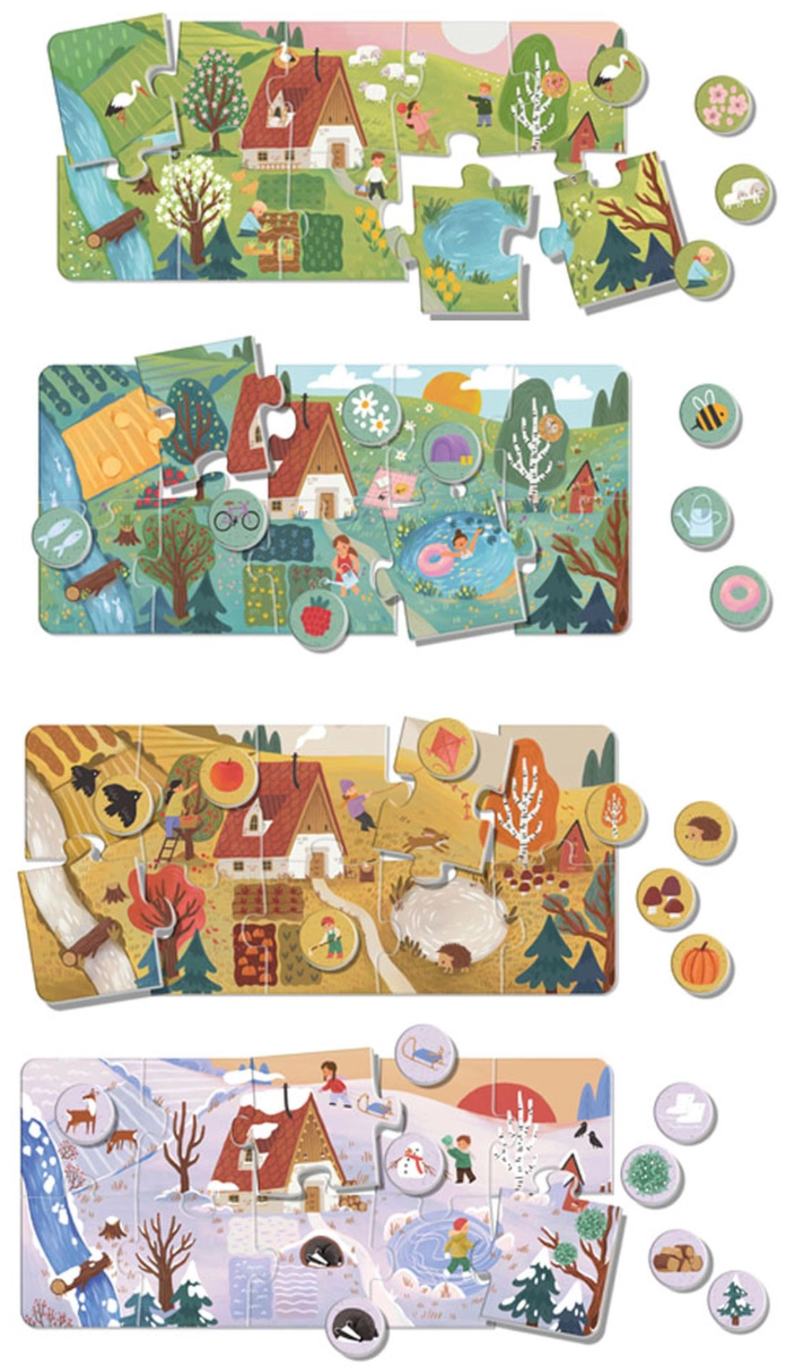 Το μεγάλο παζλ λότο εποχές KukiKuk προσφέρει στα παιδιά τέσσερις όμορφες σκηνές – άνοιξη, καλοκαίρι, φθινόπωρο και χειμώνα. Κάθε εποχή συναρμολογείται από 10 μεγάλα κομμάτια και στη συνέχεια τα παιδιά αντιστοιχίζουν 8 στρογγυλές μάρκες με χαρακτηριστικά μοτίβα. Με βάση τις αρχές Montessori, τα παιδιά ανακαλύπτουν, ταξινομούν και συνδέουν στοιχεία σύμφωνα με τη αισθητηριακή αντίληψη.