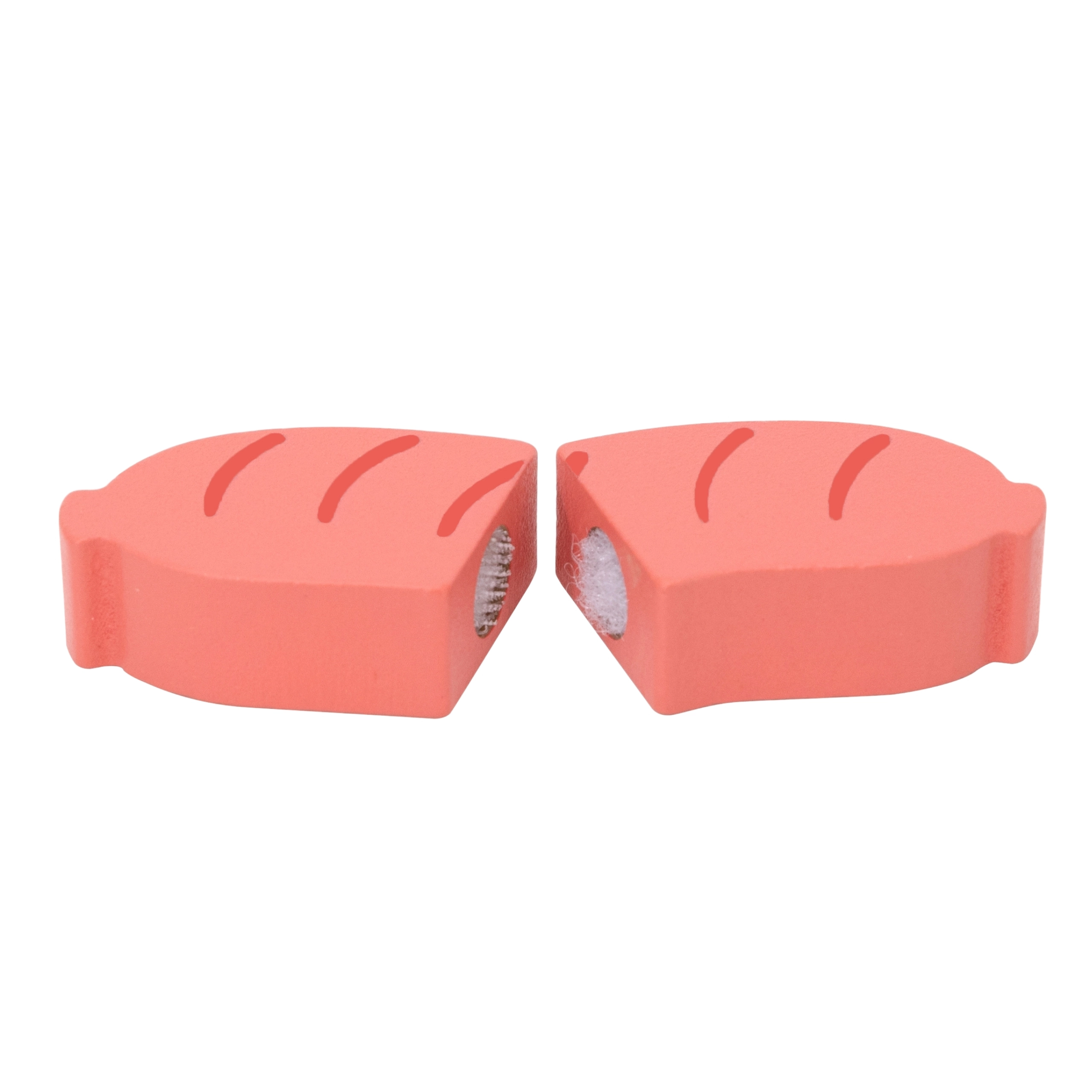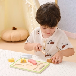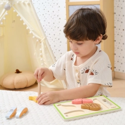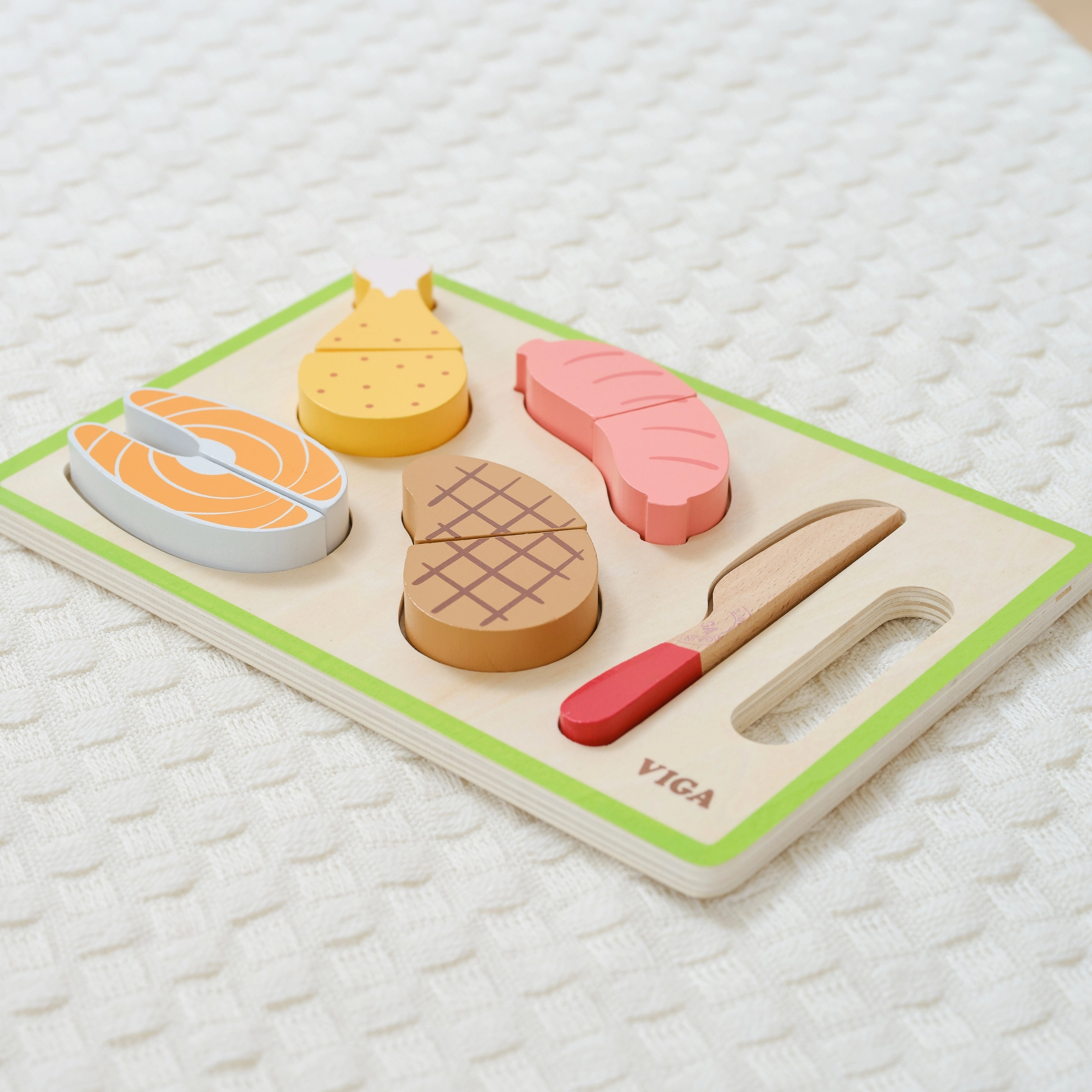 Αυτό το ξύλινο σετ κοπής προσφέρει στα παιδιά μια ρεαλιστική εμπειρία μαγειρικής με ασφαλή μορφή. Τα επιμέρους κομμάτια “κρέατος” ενώνονται με βέλκρο, ώστε να χωρίζονται εύκολα με το ξύλινο μαχαιράκι και να συναρμολογούνται ξανά. Το παιχνίδι αναπτύσσει φυσικά τη λεπτή κινητικότητα, τη λογική σκέψη και τη συνεργασία κατά τη διάρκεια κοινής διασκέδασης με γονείς ή φίλους.