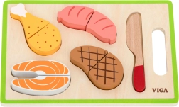 Τα κομμάτια “κρέατος” είναι χωρισμένα και ενώνονται με βέλκρο – τα παιδιά μπορούν επανειλημμένα να τα “κόβουν” με το ξύλινο μαχαιράκι και να τα συναρμολογούν ξανά, κάτι που είναι διασκεδαστικό και εκπαιδευτικό.