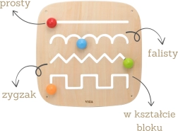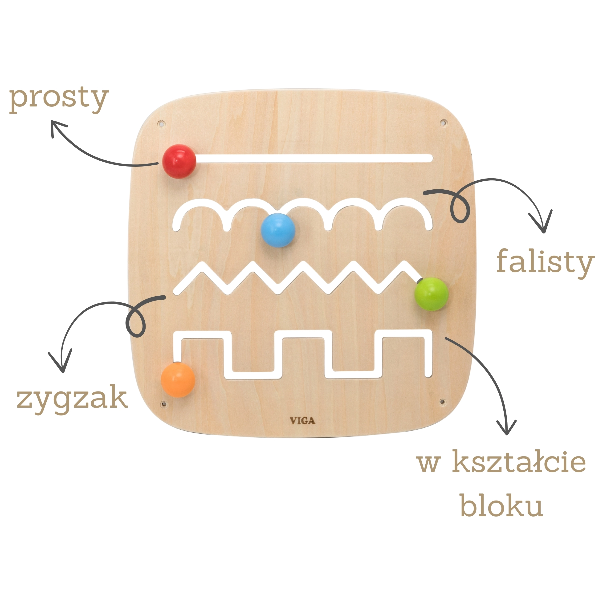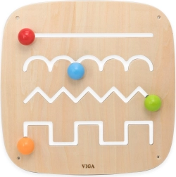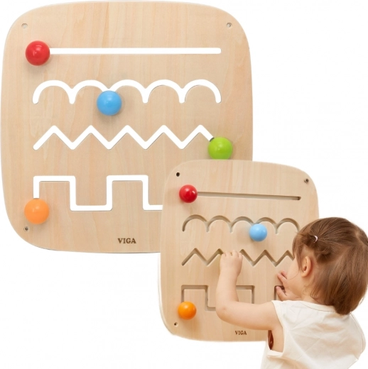 Ο ξύλινος πίνακας VIGA μετατρέπει το καθημερινό παιχνίδι σε ουσιαστική δραστηριότητα. Τα παιδιά μετακινούν τις μπαλίτσες σε διαφορετικές διαδρομές, εξερευνούν ευθείες, κύματα, ζιγκ-ζαγκ και μπλοκ σχήματα, εξασκούν τη λαβή, την ακρίβεια της κίνησης και μαθαίνουν έννοιες όπως καμπύλες και γωνίες. Το φυσικό ξύλο, οι στρογγυλεμένες γωνίες και η στιβαρή στερέωση εξασφαλίζουν ασφάλεια σε κάθε άγγιγμα.