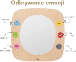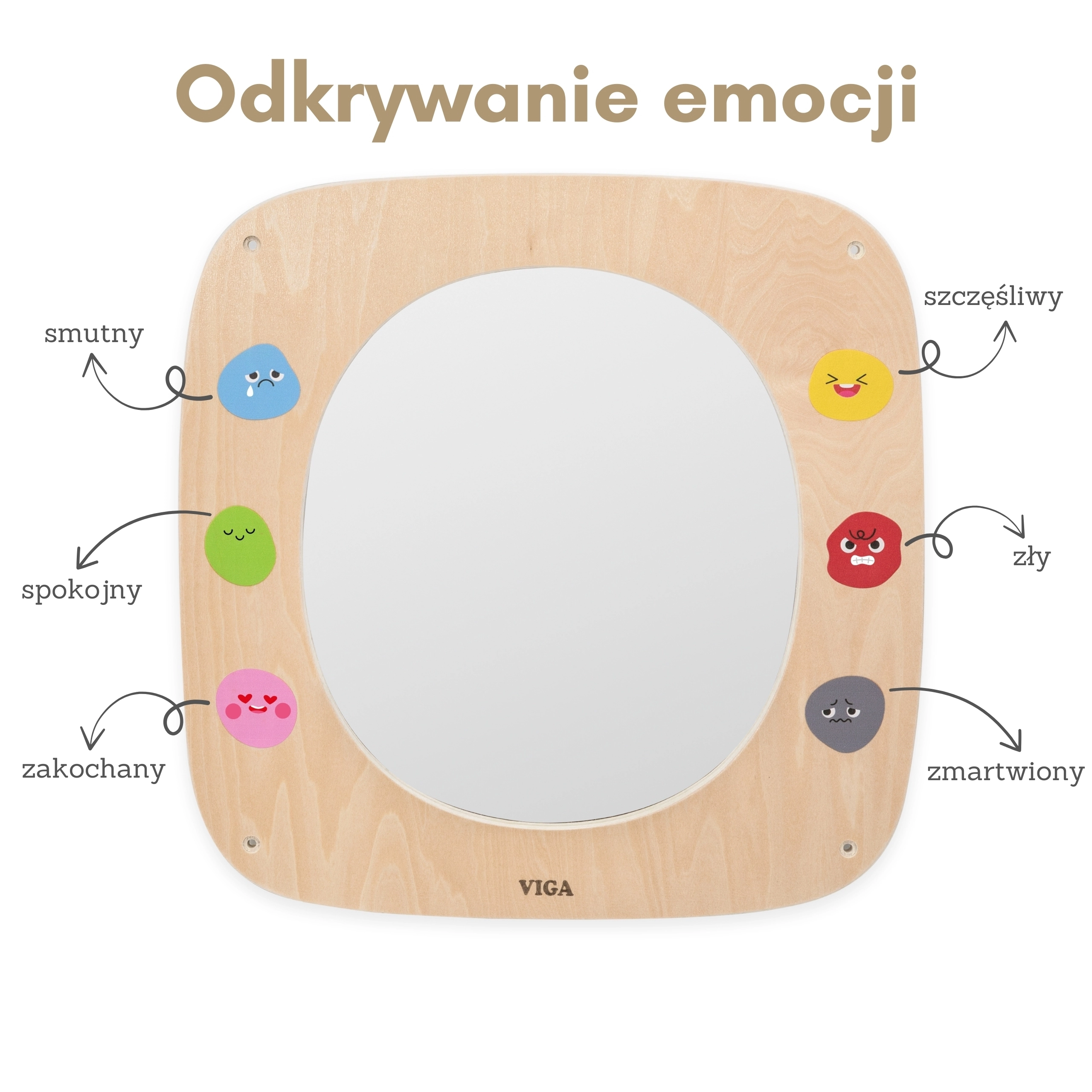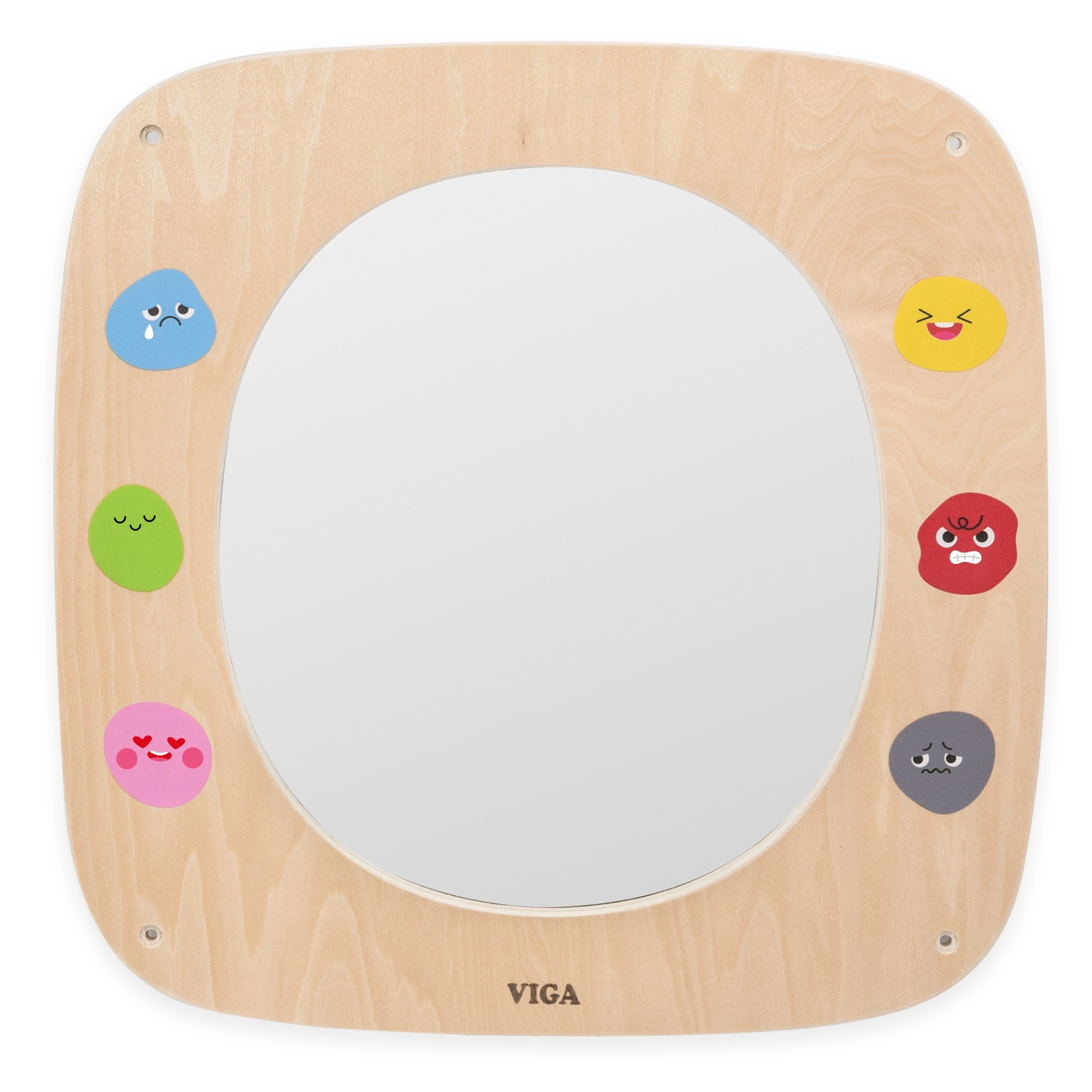 Ο ξύλινος καθρέφτης-πίνακας VIGA είναι ιδανικός για παιδικό δωμάτιο, νηπιαγωγεία και γωνιές παιχνιδιού. Ο μεγάλος ασφαλής καθρέφτης με ευδιάκριτο πλαίσιο βοηθά τα παιδιά να ανακαλύπτουν τις δικές τους εκφράσεις, να μιμούνται τη μιμητική και να μαθαίνουν να διακρίνουν τα συναισθήματα. Τα πολύχρωμα emoticons γύρω από το πλαίσιο εμπνέουν συζητήσεις για τα συναισθήματα και καλλιεργούν φυσικά τη συναισθηματική νοημοσύνη.