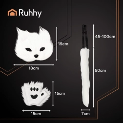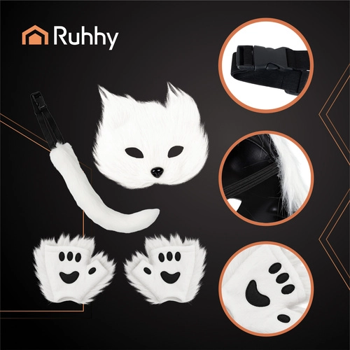 Το στιλάτο και παιχνιδιάρικο σετ RUHHY 4 σε 1 σε λευκό χρώμα είναι εξαιρετική επιλογή για λάτρεις του cosplay, την κοινότητα FURRY/Therian καθώς και φίλους του anime και της εναλλακτικής αισθητικής. Η μάσκα με λάστιχο εφαρμόζει άνετα, η μακριά ρυθμιζόμενη ουρά με εύκαμπτο σύρμα διαμορφώνεται εύκολα σε οποιοδήποτε σχήμα και τα πατουσάκια/γαντάκια ολοκληρώνουν τη μεταμόρφωση. Η ελαφριά κατασκευή εξασφαλίζει άνεση σε πολύωρη χρήση.