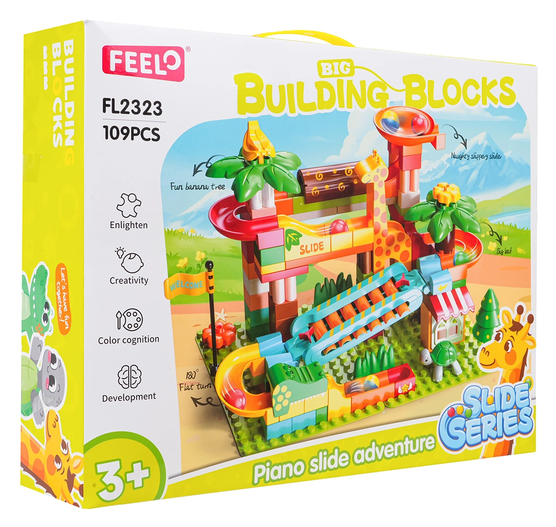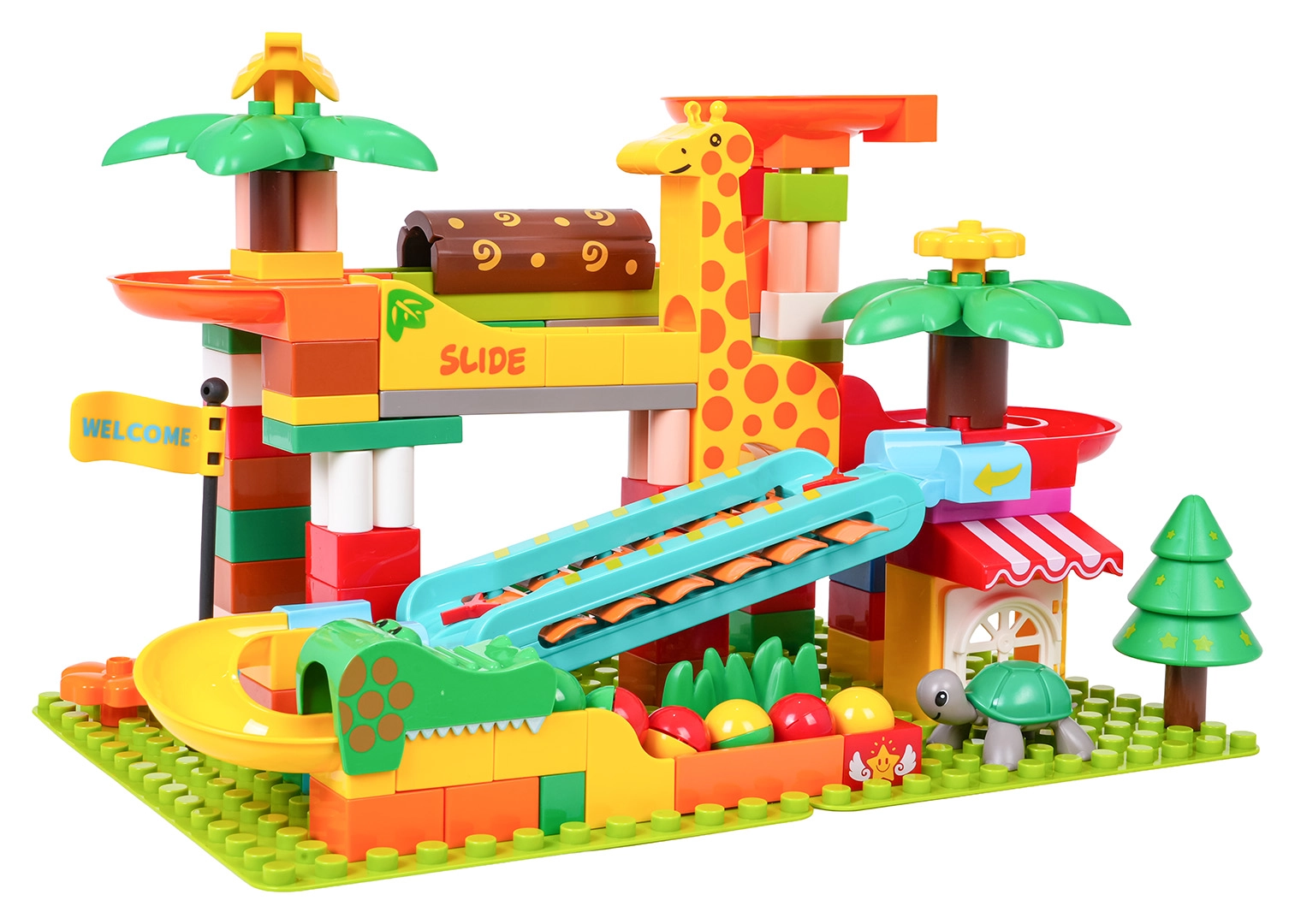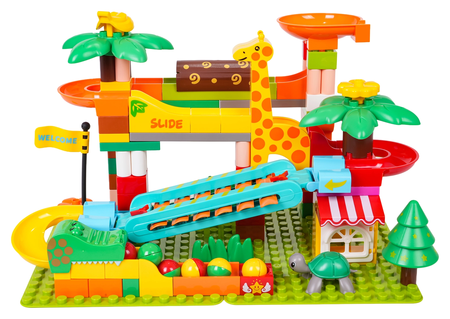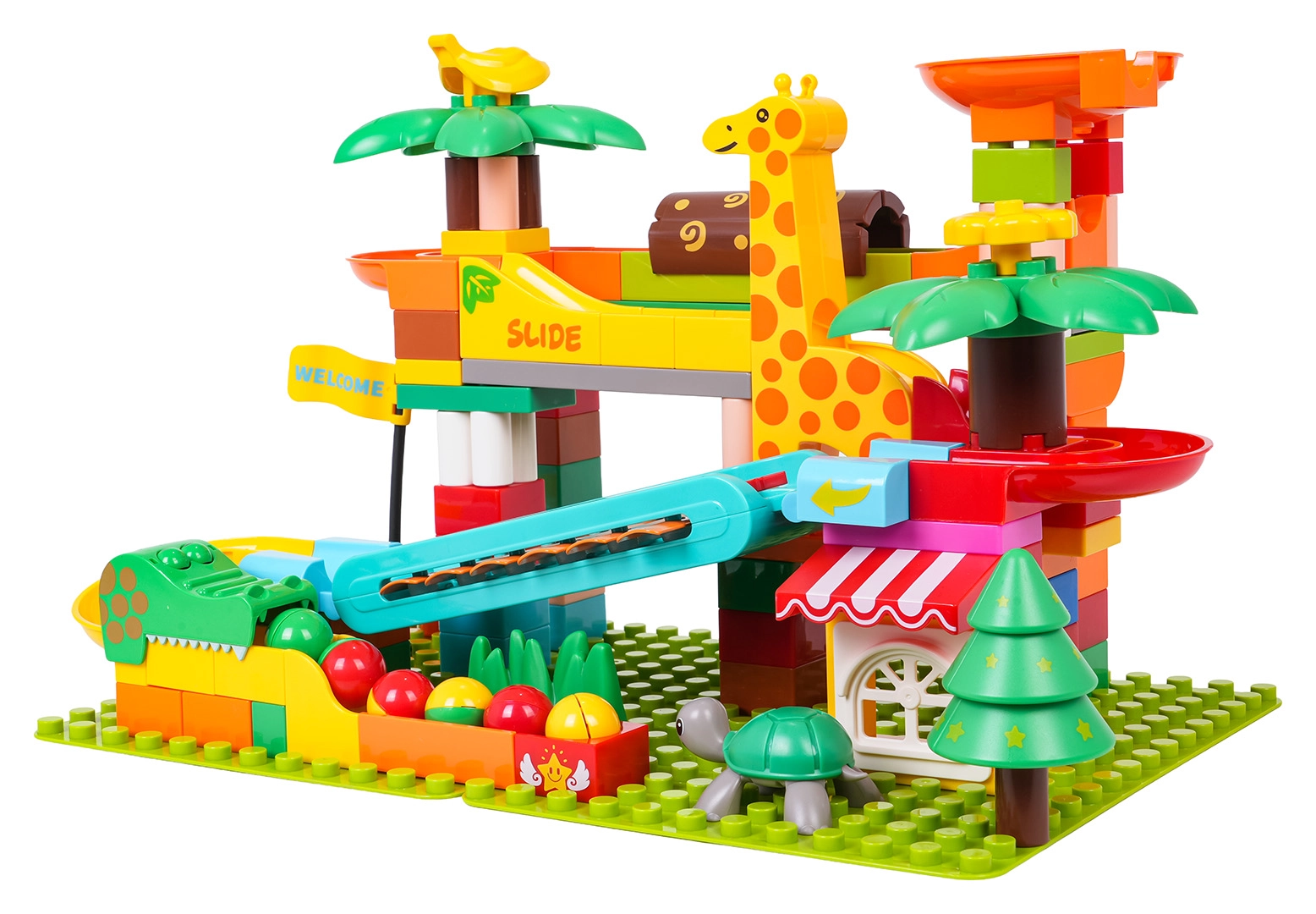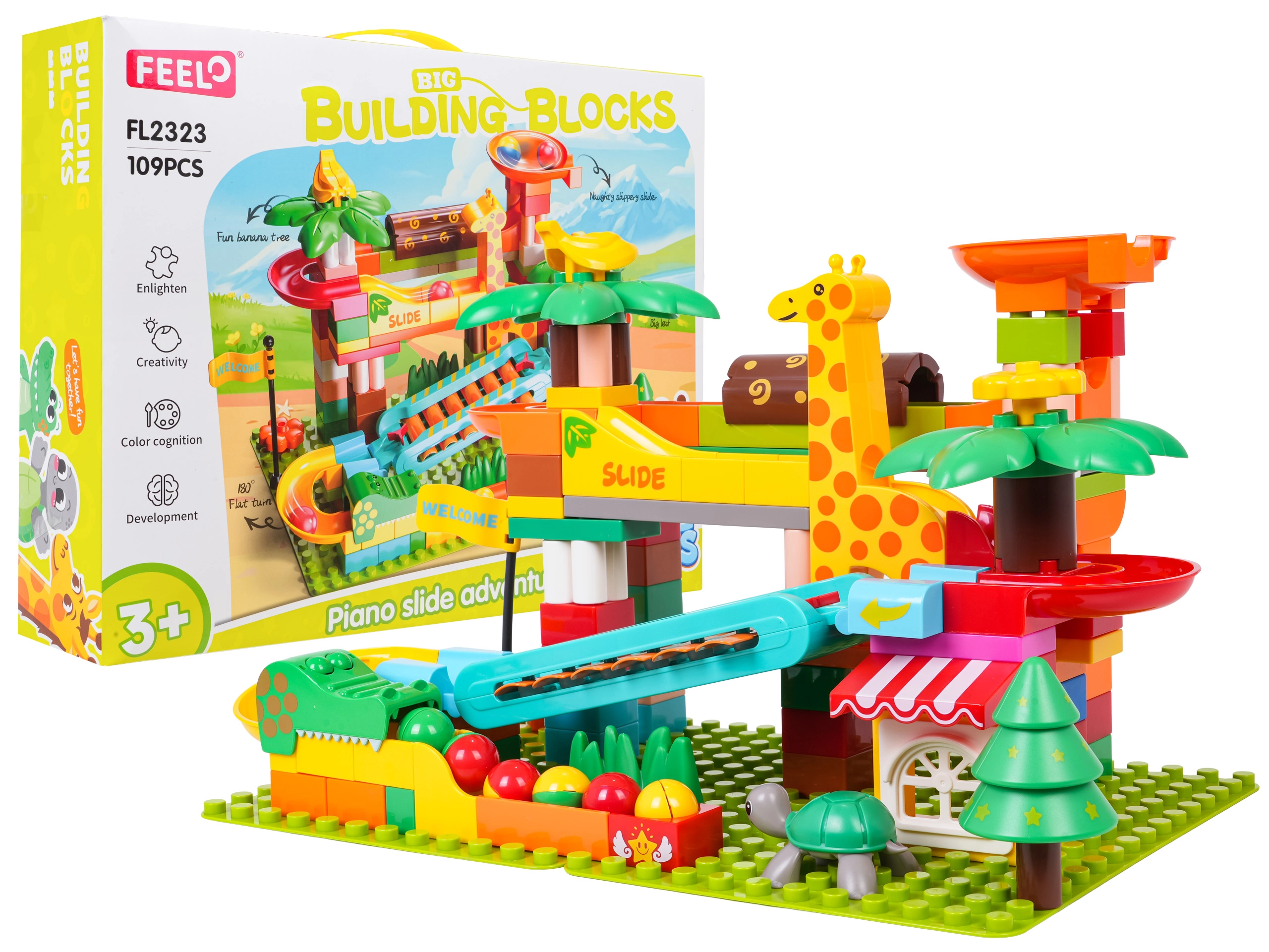 Αυτό το δημιουργικό σετ κατασκευής φέρνει στο παιδικό δωμάτιο ατμόσφαιρα σαφάρι: φοίνικες, ζωάκια και σπιτάκι συμπληρώνονται από μια επιμελώς σχεδιασμένη διαδρομή μπίλιας με τσουλήθρες, χωνιά και στοιχείο πιάνου – όταν οι μπίλιες περνούν πάνω από τα ξυλόφωνα, δημιουργούν χαρούμενες μελωδίες. Σταθερή βάση και εύκολο κούμπωμα των κομματιών εξασφαλίζουν άνετη κατασκευή και παιχνίδι.