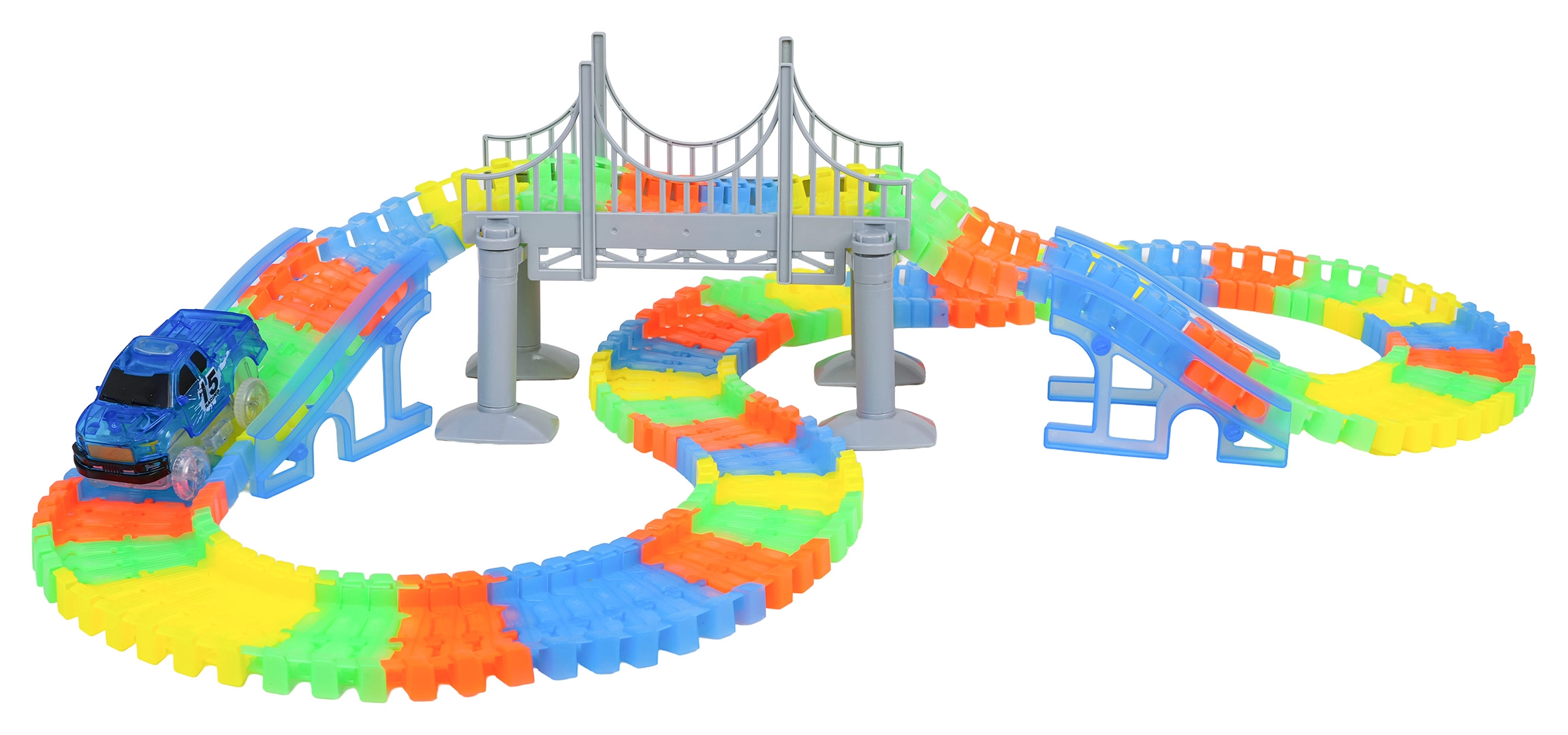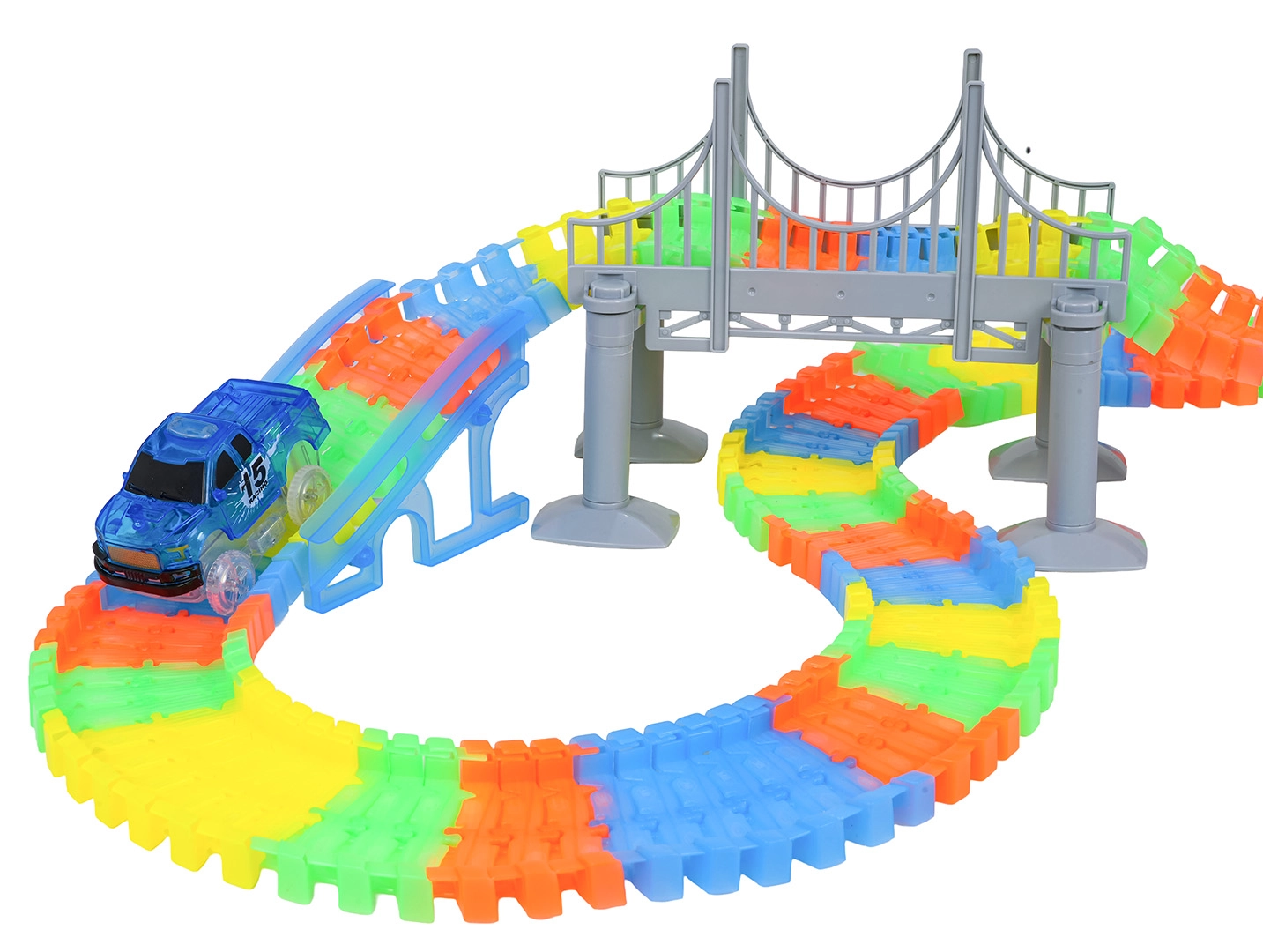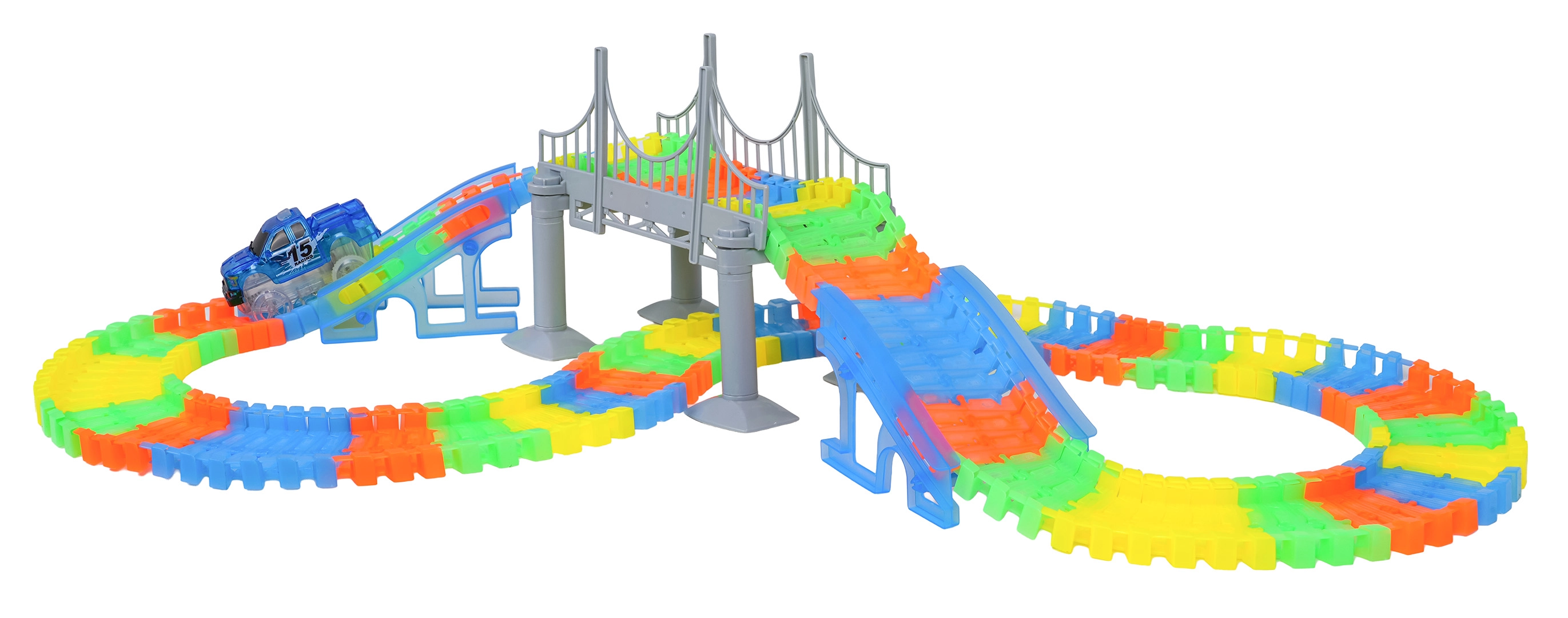 Αυτή η δημιουργική αγωνιστική πίστα προσφέρει σε παιδιά από 3 ετών ώρες ευφάνταστου παιχνιδιού. Τα κομμάτια κουμπώνουν εύκολα μεταξύ τους, η πίστα είναι λυγιστική και περιστρεφόμενη, ώστε να φτιάχνετε γέφυρες, ράμπες και τολμηρές στροφές. Η φθορίζουσα κατασκευή των ραγών φωτίζει το δωμάτιο όταν σβήνουν τα φώτα.