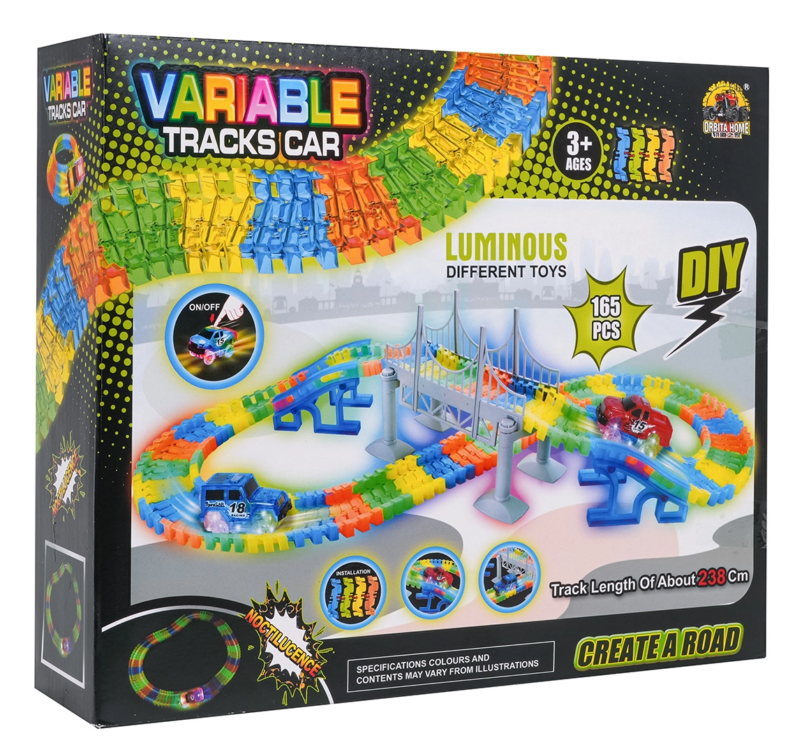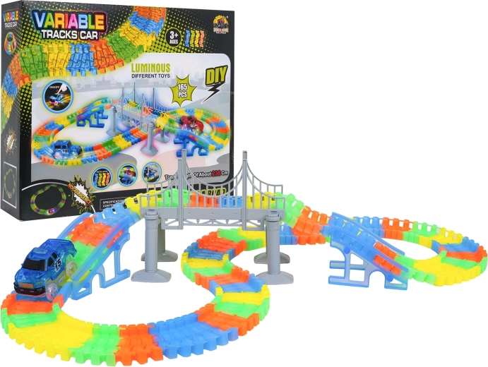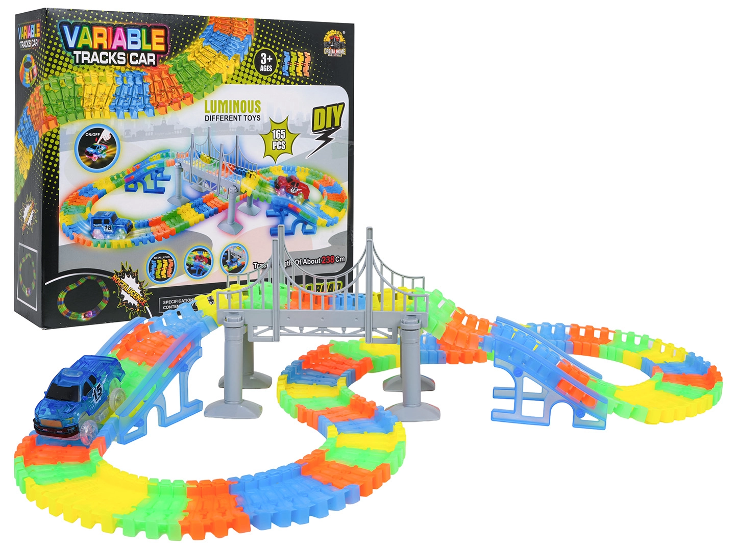 Αυτή η δημιουργική αγωνιστική πίστα προσφέρει σε παιδιά από 3 ετών ώρες ευφάνταστου παιχνιδιού. Τα κομμάτια κουμπώνουν εύκολα μεταξύ τους, η πίστα είναι λυγιστική και περιστρεφόμενη, ώστε να φτιάχνετε γέφυρες, ράμπες και τολμηρές στροφές. Η φθορίζουσα κατασκευή των ραγών φωτίζει το δωμάτιο όταν σβήνουν τα φώτα.