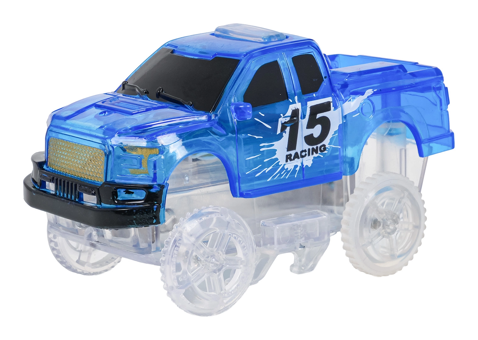 Το διάφανο αγωνιστικό αυτοκινητάκι με LED ζωντανεύει την πίστα. Αρκεί ένα πάτημα στο κουμπί στην οροφή. Τροφοδοσία 2× AA (δεν περιλαμβάνονται).