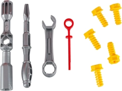 Στη συσκευασία περιλαμβάνεται πλούσιο σετ μερών και εργαλείων: 31 βίδες και στρίφωνα, δίσκολο κλειδί δύο μερών και κατσαβίδι, γαλλικό/γερμανικό κλειδί, τροχοί με ζάντες, τιμόνι, καπό με κινητήρα και αυτοκόλλητα για εξατομίκευση. Έτσι τα παιδιά εξασκούν λεπτή κινητικότητα, υπομονή και λογική σκέψη – ενώ διασκεδάζουν.