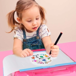 Στη συσκευασία περιλαμβάνονται 6 φύλλα με μοτίβα (συνολικά 72 εικόνες), σετ με 12 ξυλομπογιές και 12 μαρκαδόρους. Το τραπεζάκι διαθέτει ενσωματωμένες θήκες αποθήκευσης και διάφανο προστατευτικό καλύμμα ασφαλείας. Είναι ιδανικό για παιδιά από 3 ετών, αναπτύσσει τη λεπτή κινητικότητα, τη συγκέντρωση και τη φαντασία.