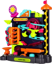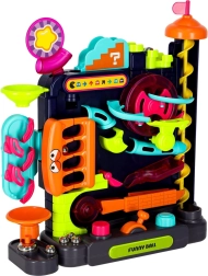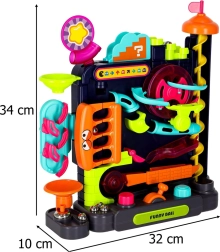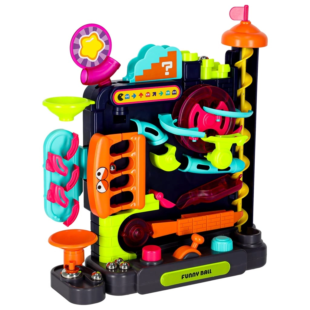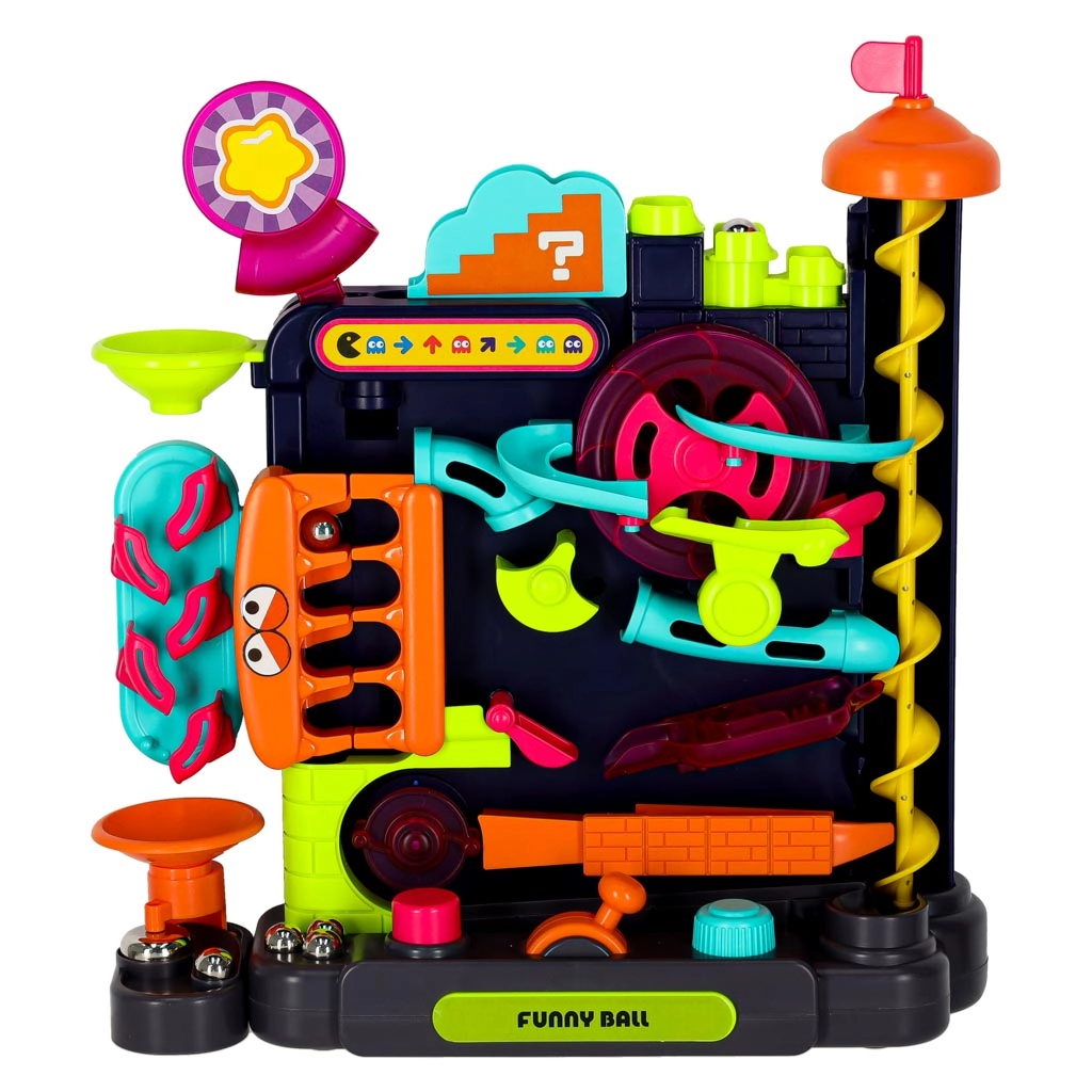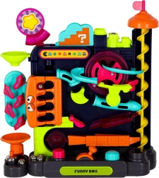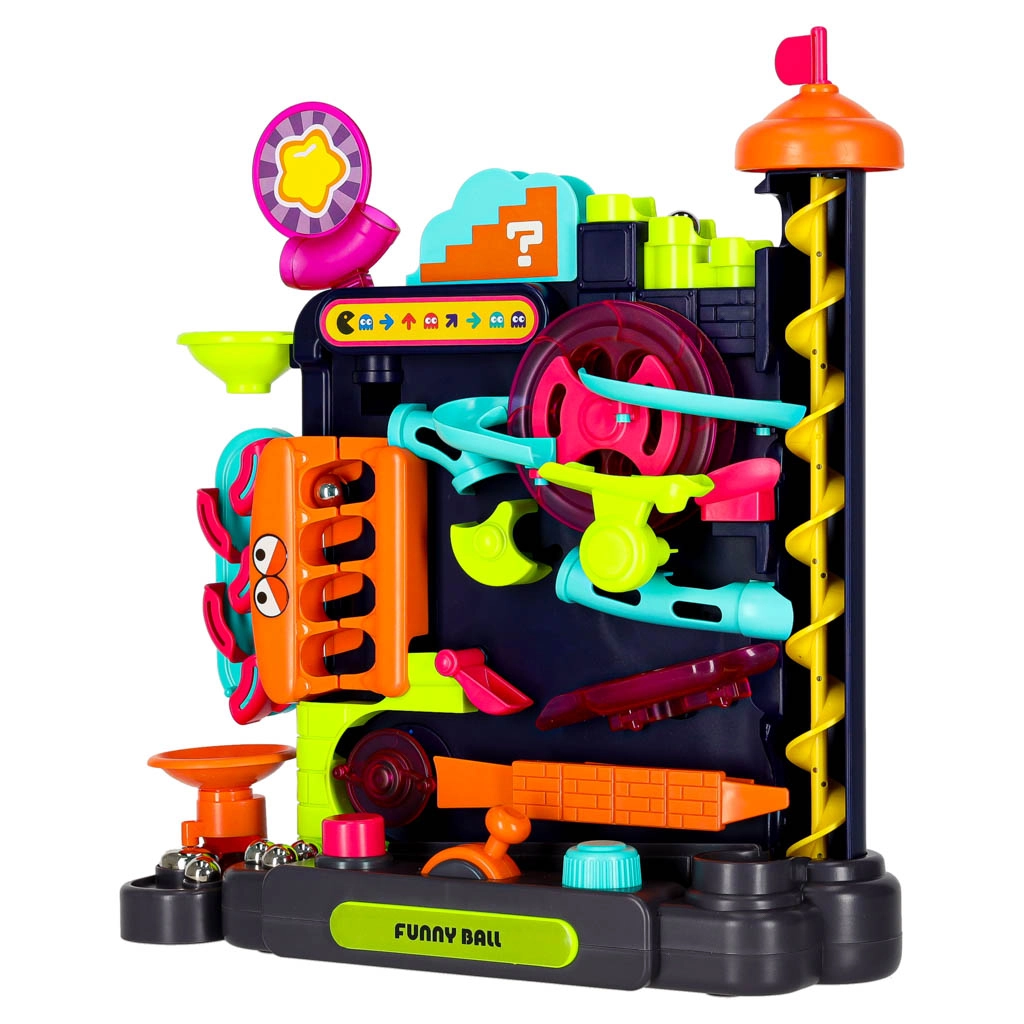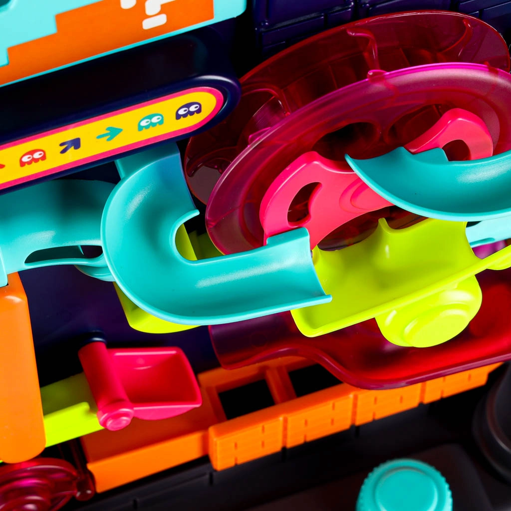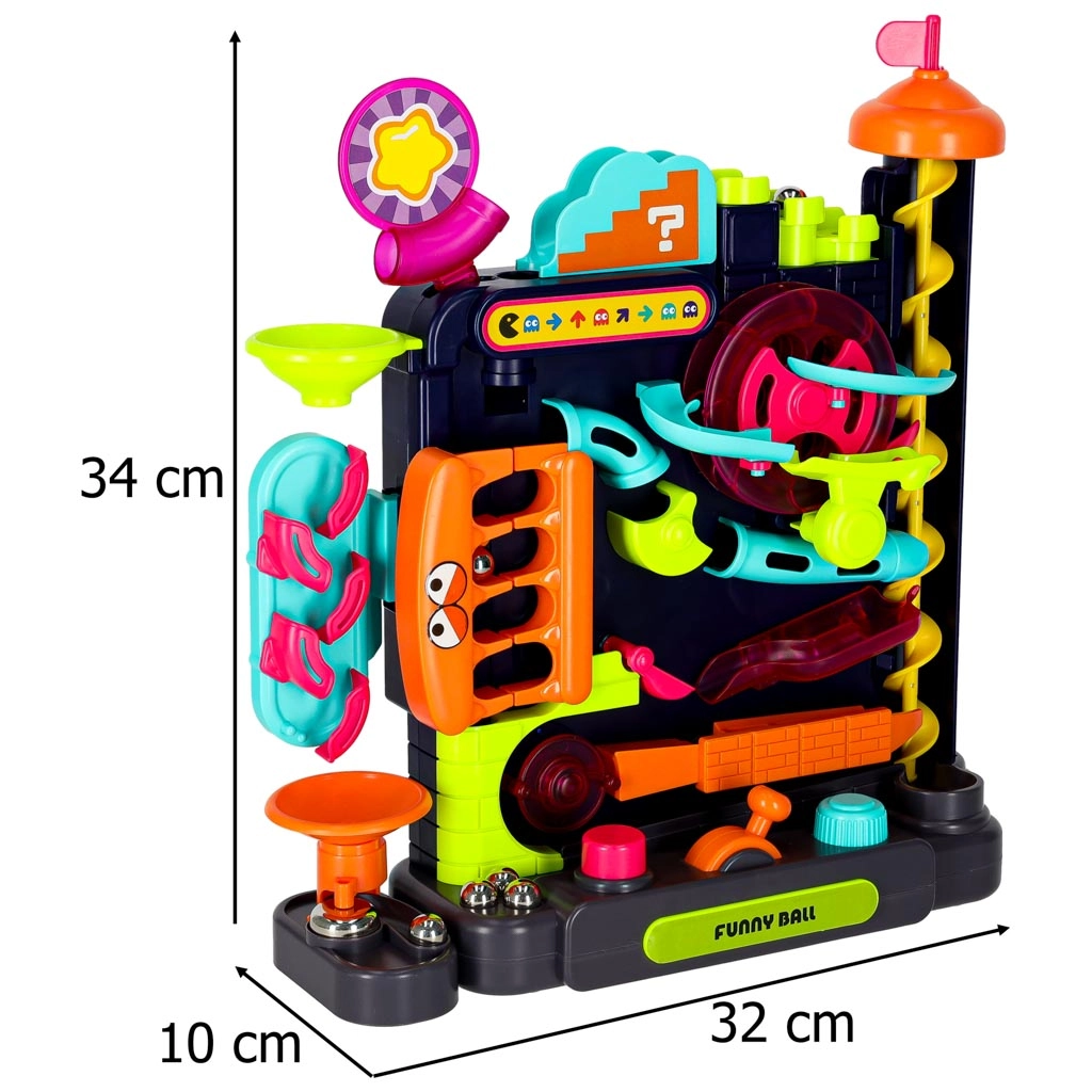 Χάρη στην στιβαρή πλαστική κατασκευή, τη σταθερή βάση και τη σαφή διαρρύθμιση των διαδρομών, το παιχνίδι είναι προσιτό ακόμη και για μικρότερα παιδιά. Περιλαμβάνεται σετ με 6 μεταλλικές μπίλιες, που μπορούν να εκκινούνται εύκολα και να επιστρέφονται επανειλημμένα στην αφετηρία. Η αφθονία διαδρομών και των κινούμενων μερών ενισχύει τη δημιουργικότητα, τη λογική σκέψη και τη συγκέντρωση.