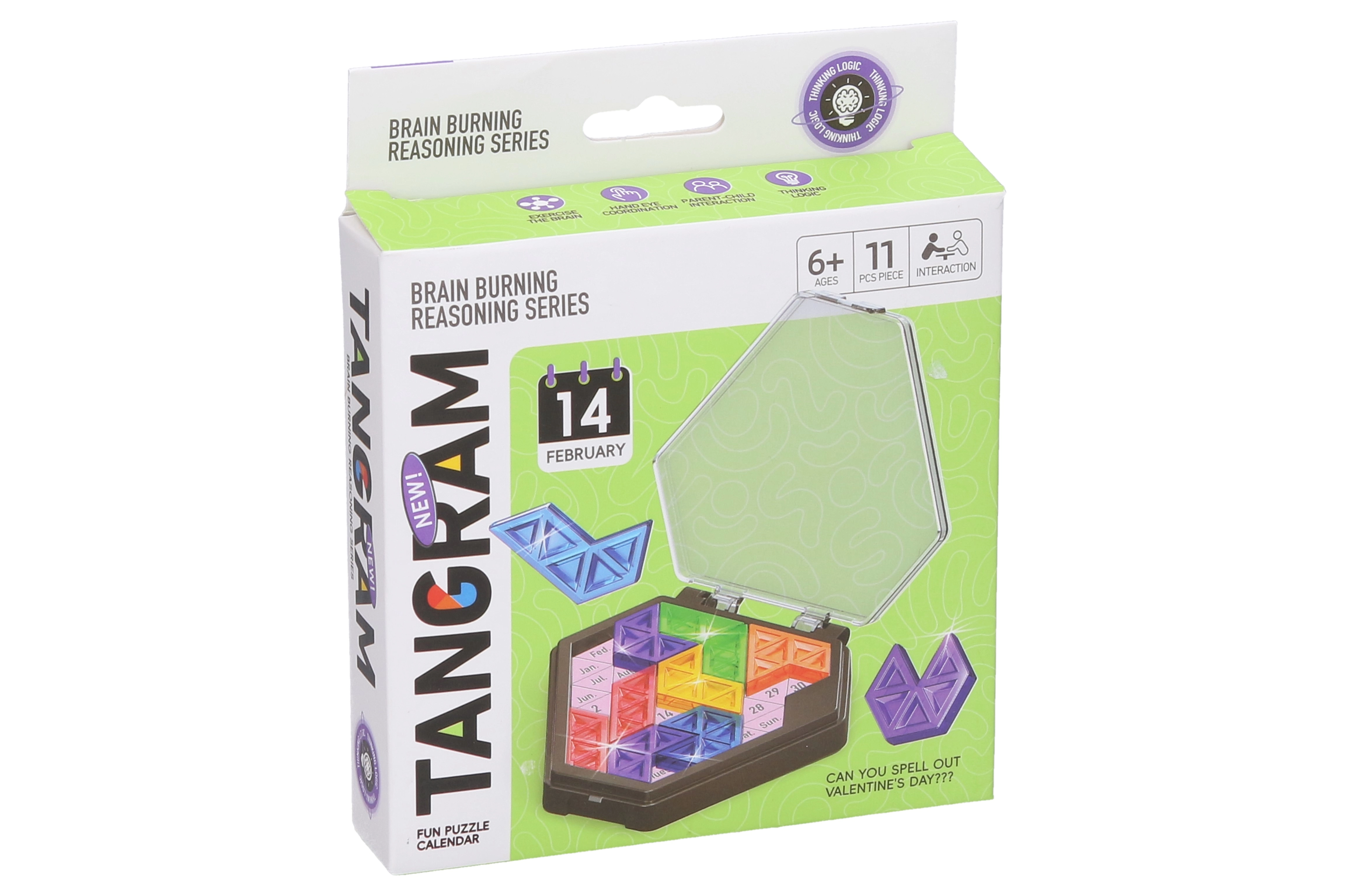 Ανακαλύψτε έναν έξυπνο και διασκεδαστικό τρόπο να εξασκείτε τη λογική και τη φαντασία σας με αυτόν τον γρίφο τάνγκραμ με διάμετρο 10 cm. Περιλαμβάνονται πρότυπα για τη σύνθεση διαφορετικών σχημάτων καθώς και συγκεκριμένων ημερομηνιών (Ημέρα της Μητέρας, Άγιος Βαλεντίνος κ.ά.), όπου στόχος είναι να τοποθετήσετε τα κομμάτια έτσι ώστε να φαίνεται μόνο η συγκεκριμένη ημερομηνία και η ημέρα της εβδομάδας. Διαθέσιμο σε 2 εκδοχές – μαύρο και λευκό.