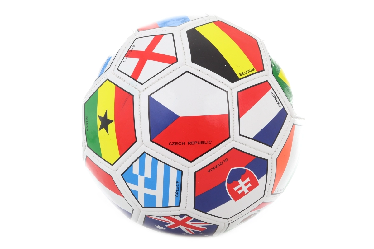 Στιλάτη ποδοσφαιρική μπάλα με μοτίβα εθνικών σημαιών για διασκεδαστικές προπονήσεις και παιχνίδι στον ελεύθερο χρόνο. Είναι κατάλληλη για χρήση σε μη σκληρές επιφάνειες (γρασίδι, χώμα), παραδίδεται ξεφουσκωμένη και μετά το φούσκωμα έχει διάμετρο περίπου 20 εκ. (ανάλογα με την πίεση). Ιδανική για παίκτες από 3 ετών, μέγεθος 5.