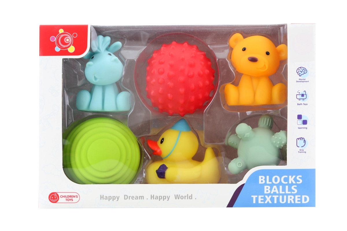 Ανακαλύψτε το διασκεδαστικό σετ λαστιχένιων παιχνιδιών νερού για τους μικρούς μας φίλους, ιδανικό για μπανιέρα και παιδική πισίνα. Η συσκευασία περιλαμβάνει 3 παιχνίδια με σχήματα και 3 παιχνίδια με ζωάκια, που υποστηρίζουν την ανάπτυξη των αισθήσεων και της λεπτής κινητικότητας. Ασφαλή για παιδιά από 6 μηνών, πιάνονται εύκολα και επιπλέουν στο νερό.