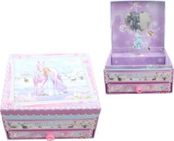 Η μαγική μουσική κοσμηματοθήκη με θέμα τον μονόκερο θα χαροποιήσει κάθε λάτρη μικρών θησαυρών. Μετά το κούρδισμα, μόλις ανοίξετε το καπάκι, η φιγούρα αρχίζει να χορεύει και ακούγεται μια ευχάριστη μελωδία. Στο εσωτερικό θα βρείτε ένα καθρεφτάκι, πρακτικό για την δοκιμή κοσμημάτων, και κάτω ένα συρταράκι για δαχτυλίδια, βραχιόλια και άλλες μικροδουλειές. Οι συμπαγείς διαστάσεις περίπου 16 × 14 × 9 cm και τα απαλά παραμυθένια μοτίβα την κάνουν ένα όμορφο αξεσουάρ για το παιδικό δωμάτιο και ιδανική ιδέα δώρου.