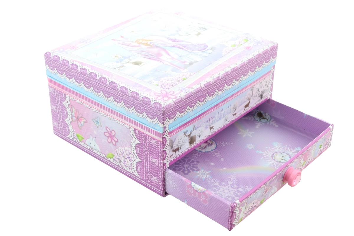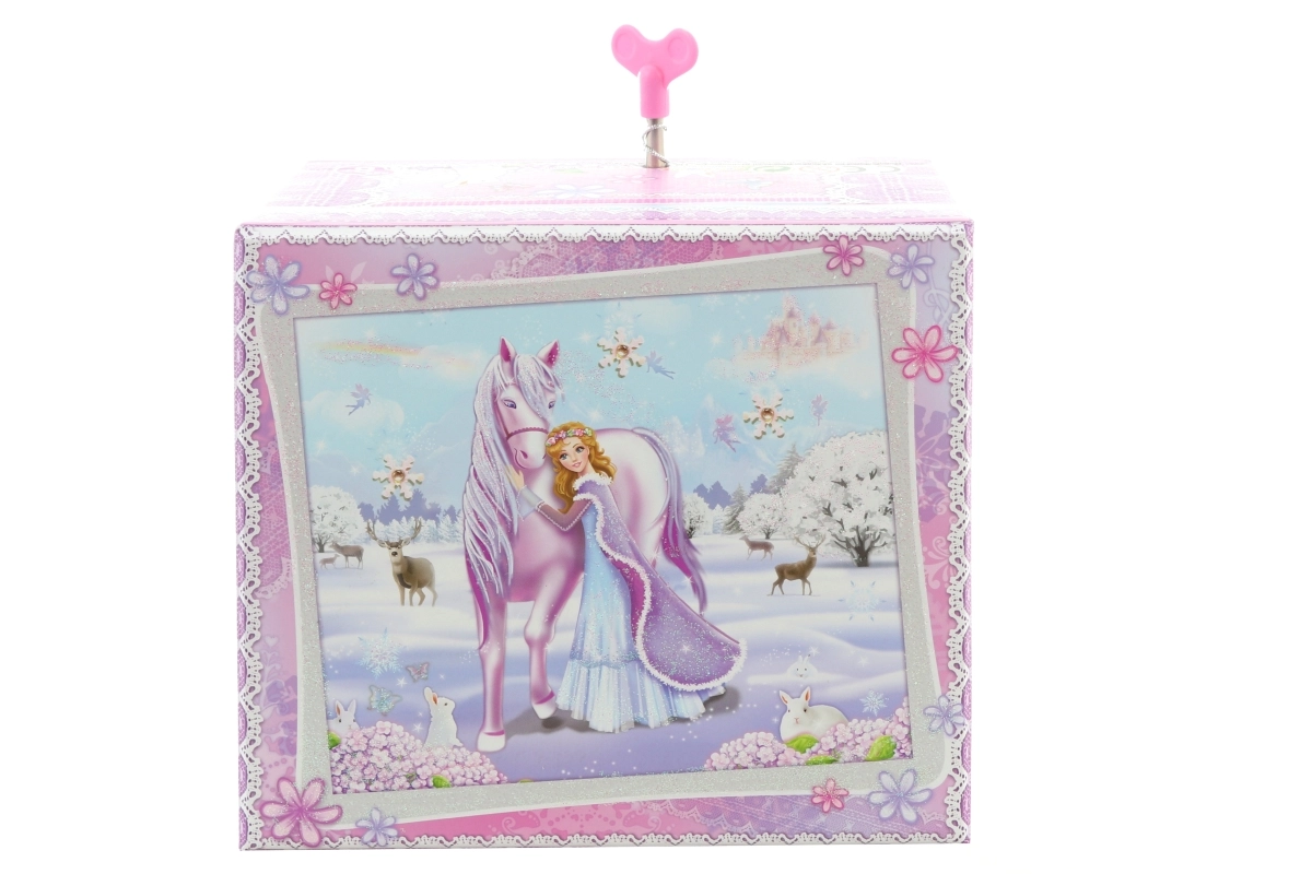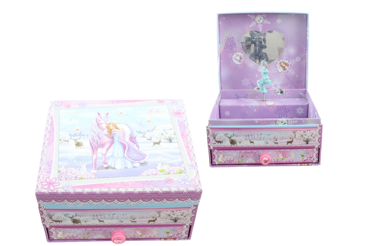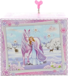 Αυτή η κομψή μουσική κοσμηματοθήκη με θέμα χειμωνιάτικη πριγκίπισσα και μονόκερο συνδυάζει διακοσμητική εμφάνιση και πρακτική οργάνωση. Με το κούρδισμα του μηχανικού μηχανισμού και το άνοιγμα του καπακιού, η φιγούρα αρχίζει να περιστρέφεται και ακούγεται μια μελωδία που δημιουργεί μαγική ατμόσφαιρα.