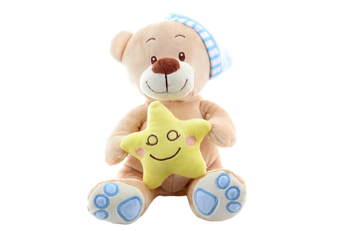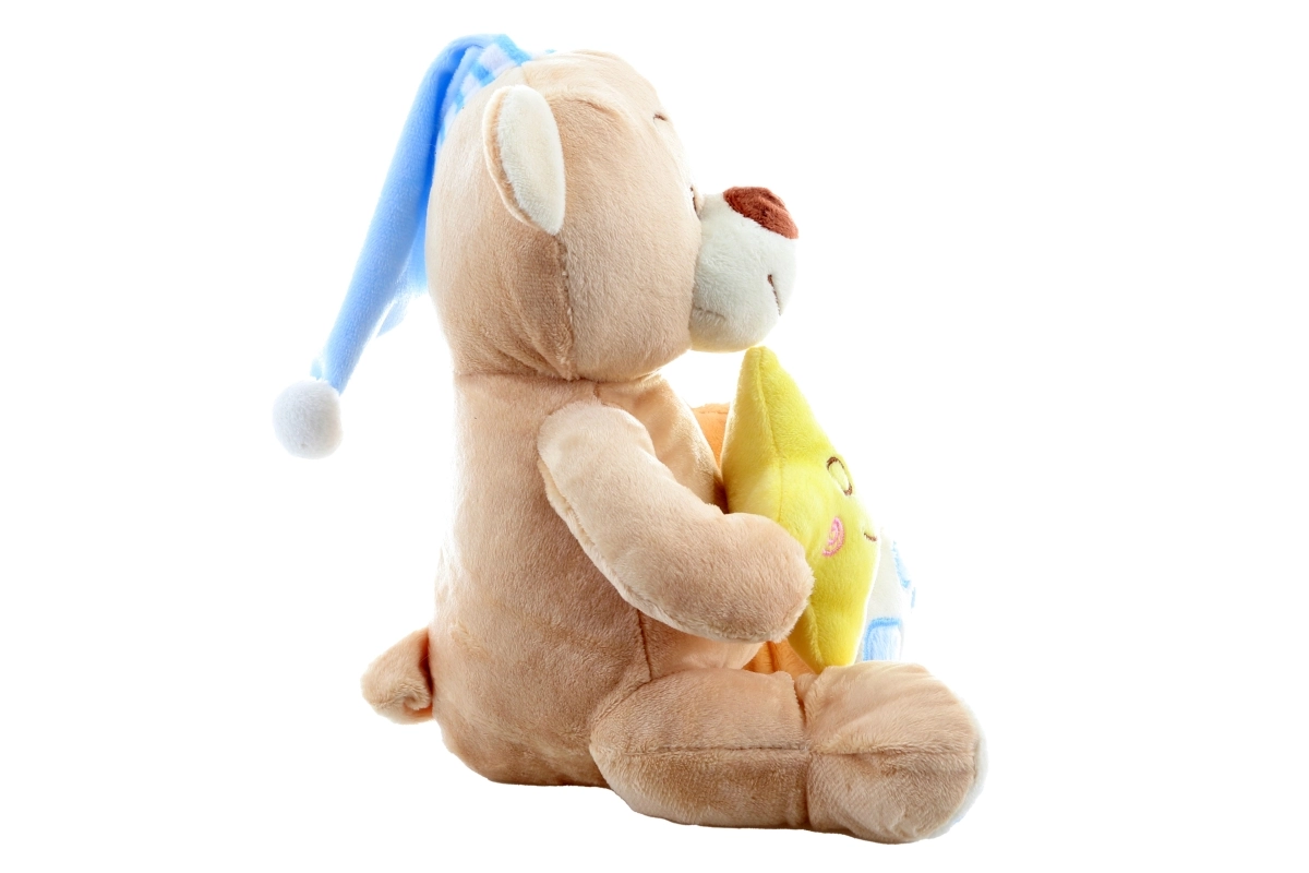 Αυτό το απαλό λούτρινο αρκουδάκι με μπλε σκουφάκι προσφέρει στα παιδιά αίσθηση ηρεμίας και ασφάλειας. Το κίτρινο αστεράκι στις πατούσες υποστηρίζει χαλαρωτικές ρουτίνες πριν τον ύπνο, ενώ τα μαλακά υλικά προσκαλούν σε αγκαλιές. Χάρη στα κεντημένα μάτια και το χαμόγελο, το παιχνίδι είναι κατάλληλο και για τα πιο μικρά.