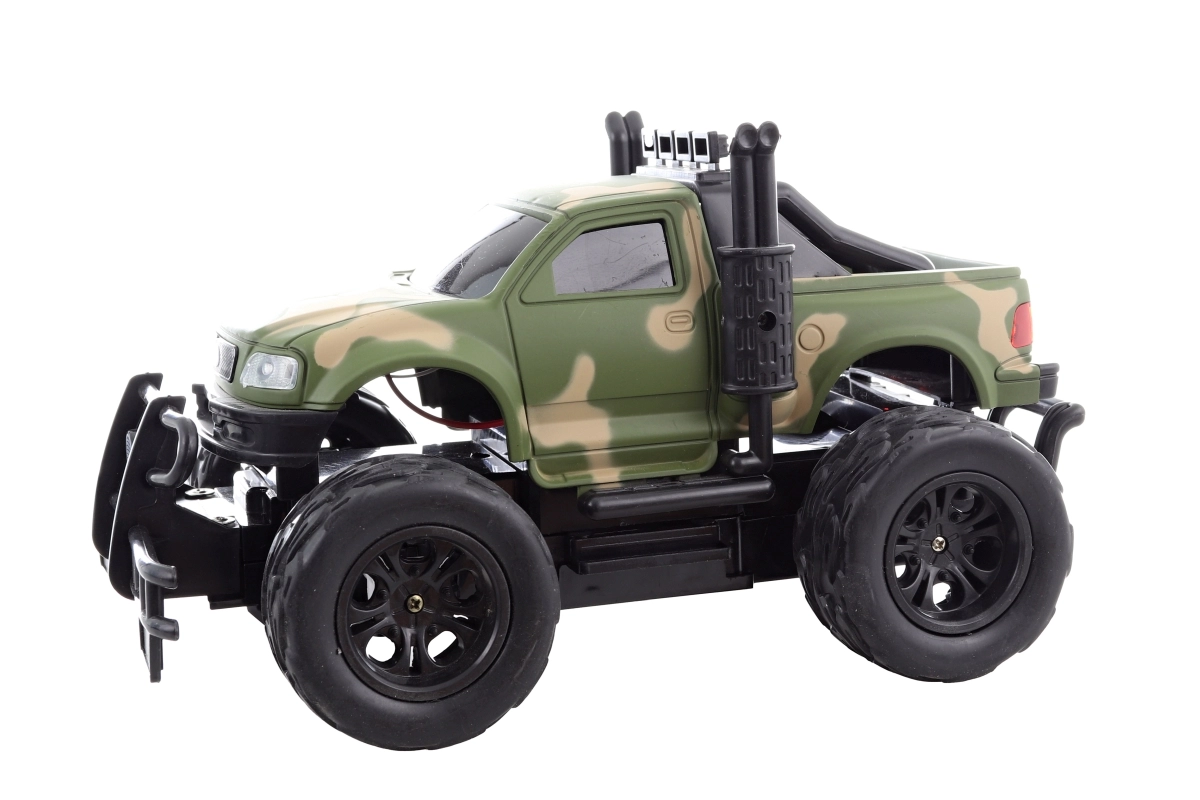 Ανθεκτικό αμάξωμα σε καμουφλάζ πράσινο, αυξημένη ανάρτηση και τεράστια ελαστικά για εύκολη κίνηση πάνω από μικρές ανωμαλίες και χαλί.