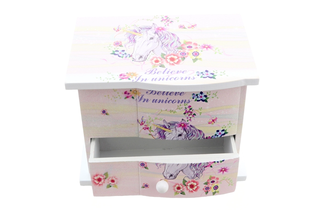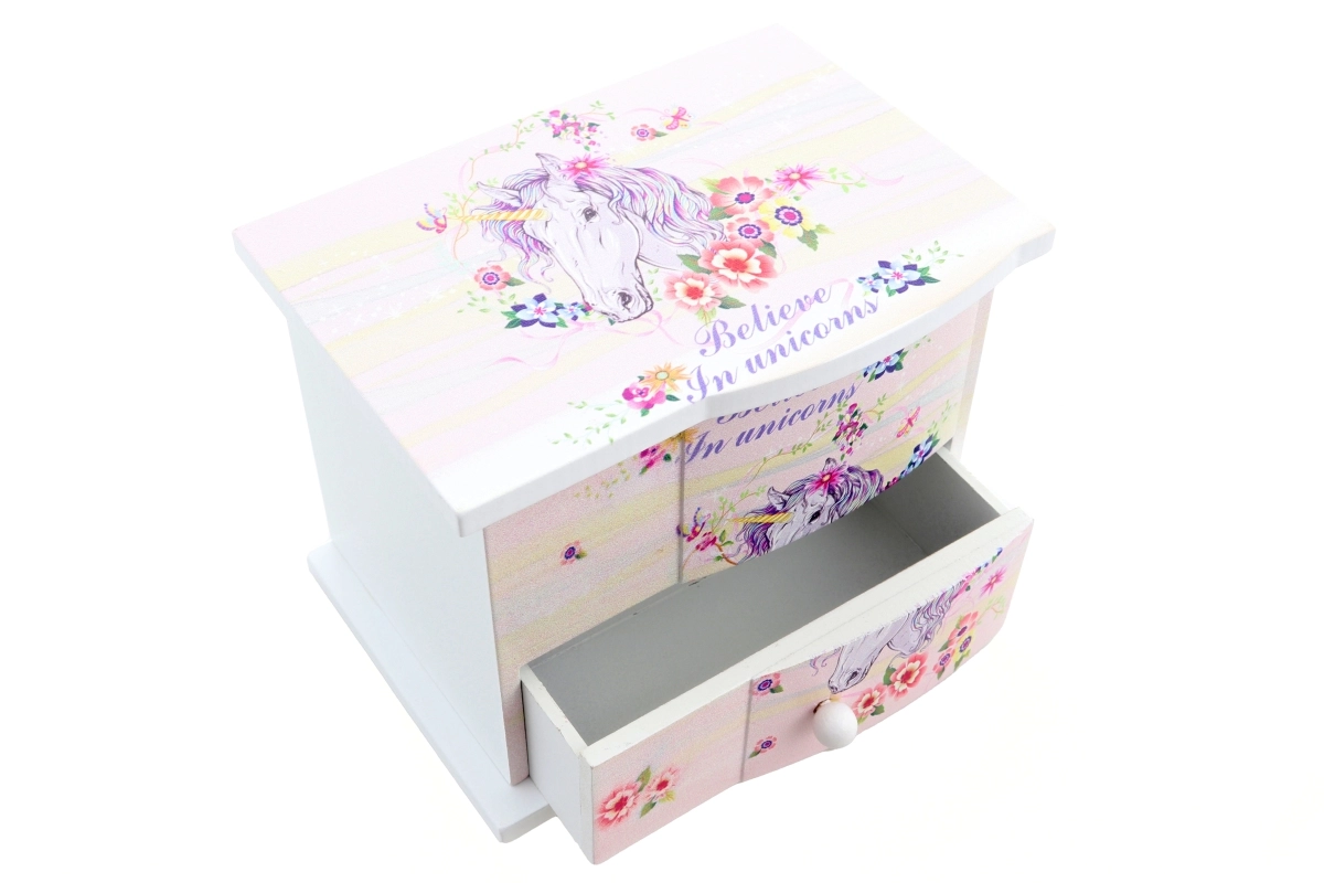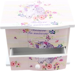 Μαγική ξύλινη κοσμηματοθήκη με θέμα μονόκερο που θα χαρίσει χαμόγελα σε κάθε μικρή κοκέτα. Με το άνοιγμα, μέσα περιστρέφεται μια καρδούλα και ακούγεται απαλή μελωδία. Διαθέτει εσωτερικό καθρεφτάκι, πρακτικό συρταράκι για μικροαντικείμενα και κλείδωμα με κλειδάκι. Ιδανικό δώρο για παιδιά από 3 ετών. Μουσικός μηχανισμός, καθρεφτάκι, συρτάρι για κοσμήματα, παιδικός σχεδιασμός με μονόκερο.