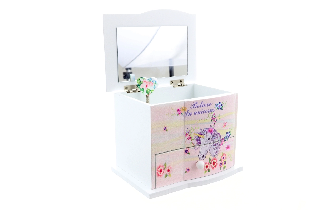 Αυτή η γοητευτική ξύλινη κοσμηματοθήκη με θέμα τον μονόκερο προστατεύει υπέροχα τους παιδικούς θησαυρούς – δαχτυλίδια, βραχιόλια και μυστικά μικροαντικείμενα. Με το άνοιγμα του καπακιού περιστρέφεται η καρδούλα και ακούγεται απαλή μουσική, που φέρνει χαμόγελο σε κάθε χρήση. Το επάνω μέρος κρύβει πρακτικό καθρεφτάκι για γρήγορη δοκιμή κοσμημάτων, ενώ κάτω θα βρείτε συρτάρι για επιπλέον μικροπράγματα.