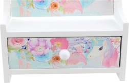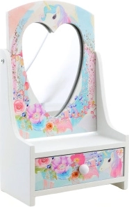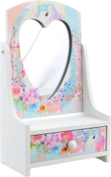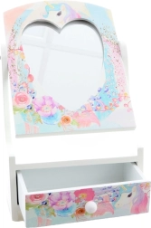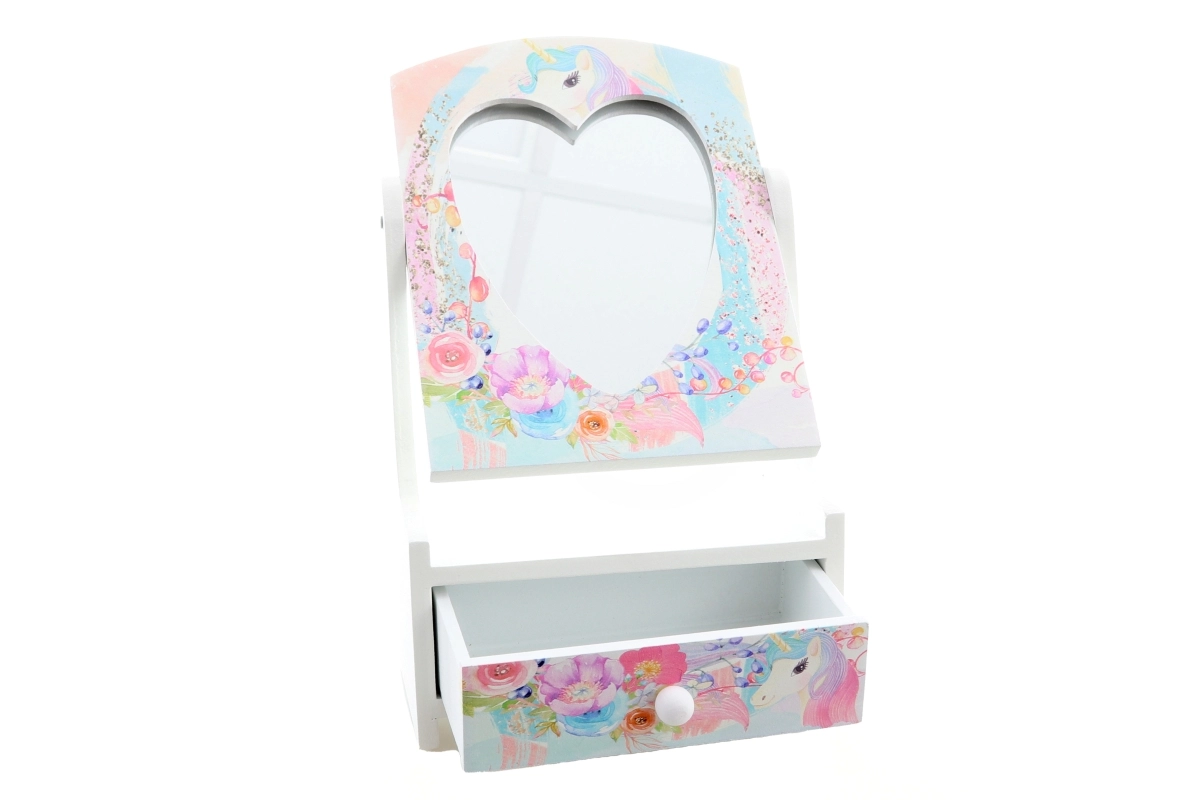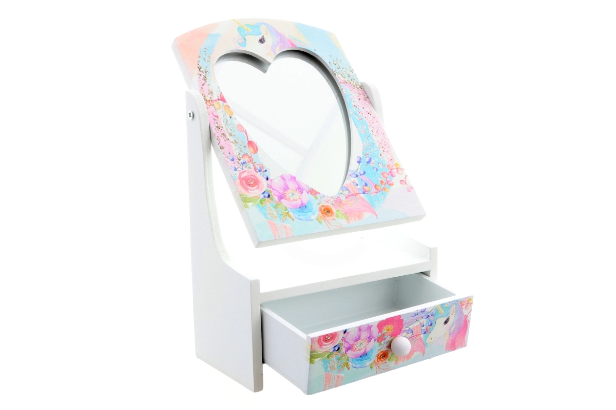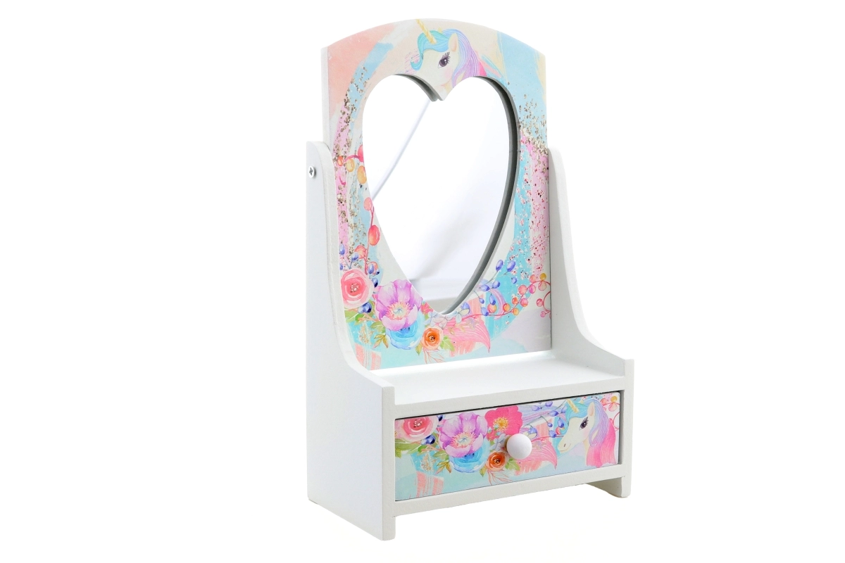 Μαγική παιδική κοσμηματοθήκη με καθρέφτη σε σχήμα καρδιάς και μοτίβο μονόκερου, ιδανική για την αποθήκευση μικρών θησαυρών. Προσφέρει πρακτικό συρταράκι, σταθερή ξύλινη κατασκευή και ασφαλή χρήση από 3 ετών.