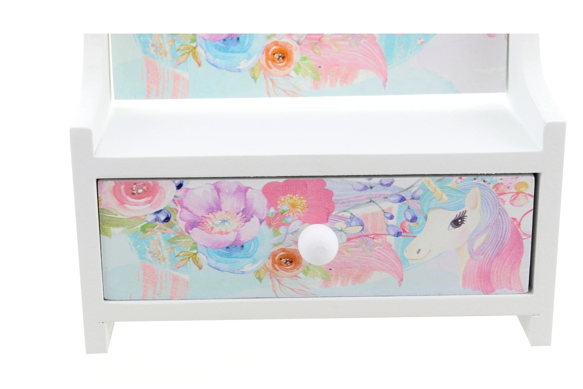 Η χαριτωμένη ξύλινη κοσμηματοθήκη με ρυθμιζόμενο καθρέφτη-καρδιά βοηθά τα παιδιά να έχουν τους θησαυρούς τους τακτοποιημένους σε ένα σημείο. Τα απαλά παστέλ λουλουδάτα και μοτίβα μονόκερου την κάνουν όμορφη διακόσμηση για το παιδικό δωμάτιο και πρακτικό βοηθό για το καθημερινό χτένισμα και το παιχνίδι.