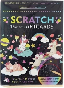 Αυτό το δημιουργικό σετ προσφέρει διασκεδαστικό ξύσιμο εικόνων με το αγαπημένο θέμα των μονόκερων. Με το παρεχόμενο ξύλινο εργαλείο αποκαλύπτετε απαλά τις έγχρωμες στρώσεις και δημιουργείτε εντυπωσιακές εικόνες, κατάλληλες για διακόσμηση ή για δώρο.