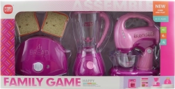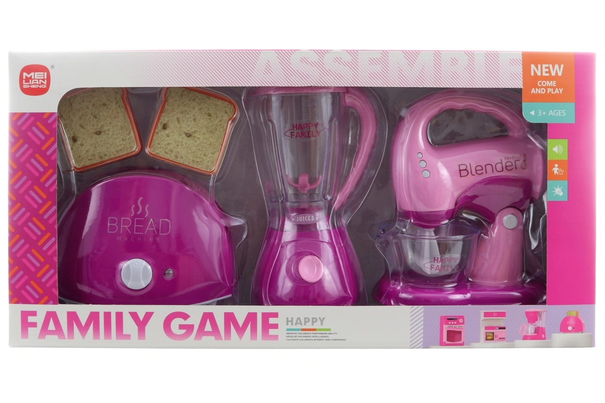 Αυτό το πολύχρωμο σετ οικιακών συσκευών προσφέρει στα παιδιά αυθεντική εμπειρία μαγειρικής. Η τοστιέρα, μόλις ενεργοποιηθεί, φωτίζει, κάνει ήχους και εκτοξεύει τις φέτες μετά από λίγο. Το μίξερ έχει διαφανές δοχείο, φωτίζει και περιστρέφεται, όπως και το χτυπητήρι, το οποίο επιπλέον θέτει ρεαλιστικά σε κίνηση τους αναδευτήρες. Όλα είναι σχεδιασμένα για ασφαλές παιδικό παιχνίδι.
