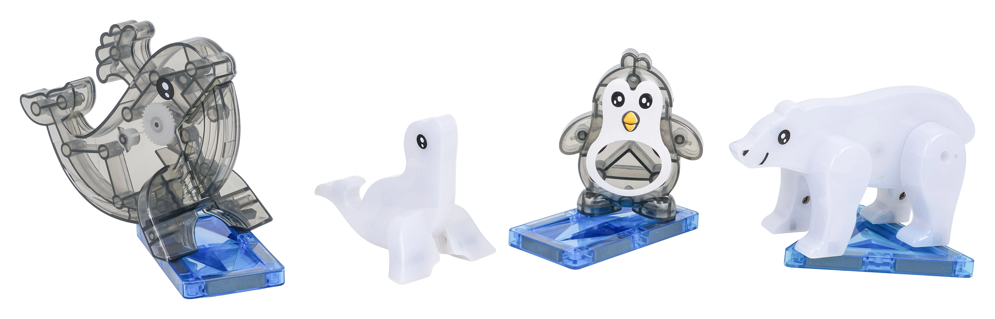 Οι φιγούρες διαθέτουν κινητά στοιχεία (το δελφίνι ανοίγει το στόμα, η αρκούδα κινεί τα πόδια, ο πιγκουίνος σηκώνει και κατεβάζει τα πτερύγια), γεγονός που ενισχύει τις φανταστικές ιστορίες και τη λεπτή κινητικότητα. Τα κομμάτια μπορούν να συνδυαστούν σε διαφορετικές γωνίες για να δημιουργηθούν απεριόριστες παραλλαγές κατασκευών – από απλά σχήματα έως σύνθετα 3D μοντέλα.