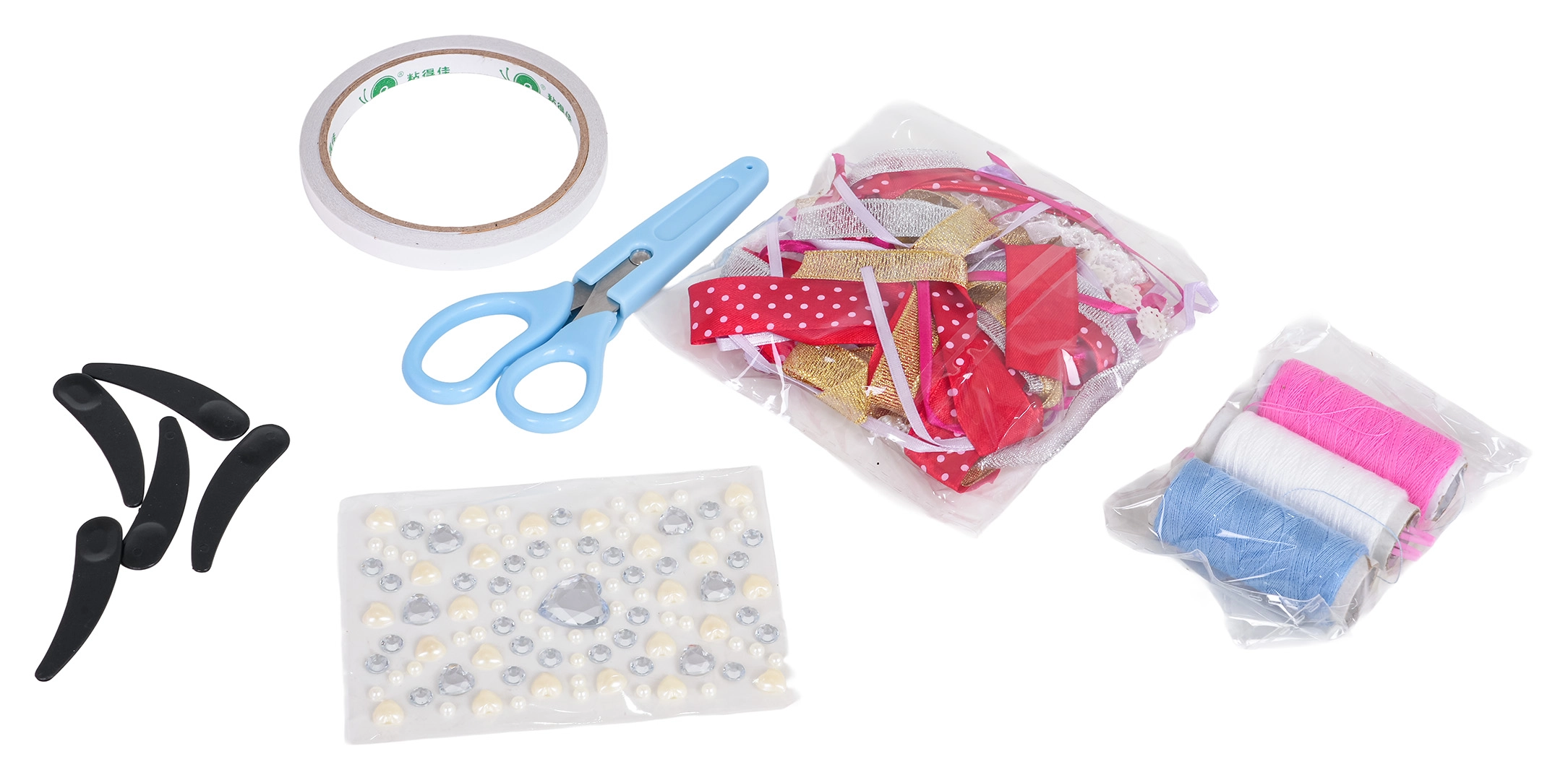 - 5× μανεκέν, κούκλα, ψαλίδι, μολύβι/κιμωλία, ταινία, 3× κλωστή, απλικέ για ύφασμα, πολύχρωμες κορδέλες, 4× σακουλάκι με ύφασμα και χαρτονένιο πατρόν, σακουλάκι με ύφασμα με πούλιες, βελόνες (πλαστικές και μεταλλικές)