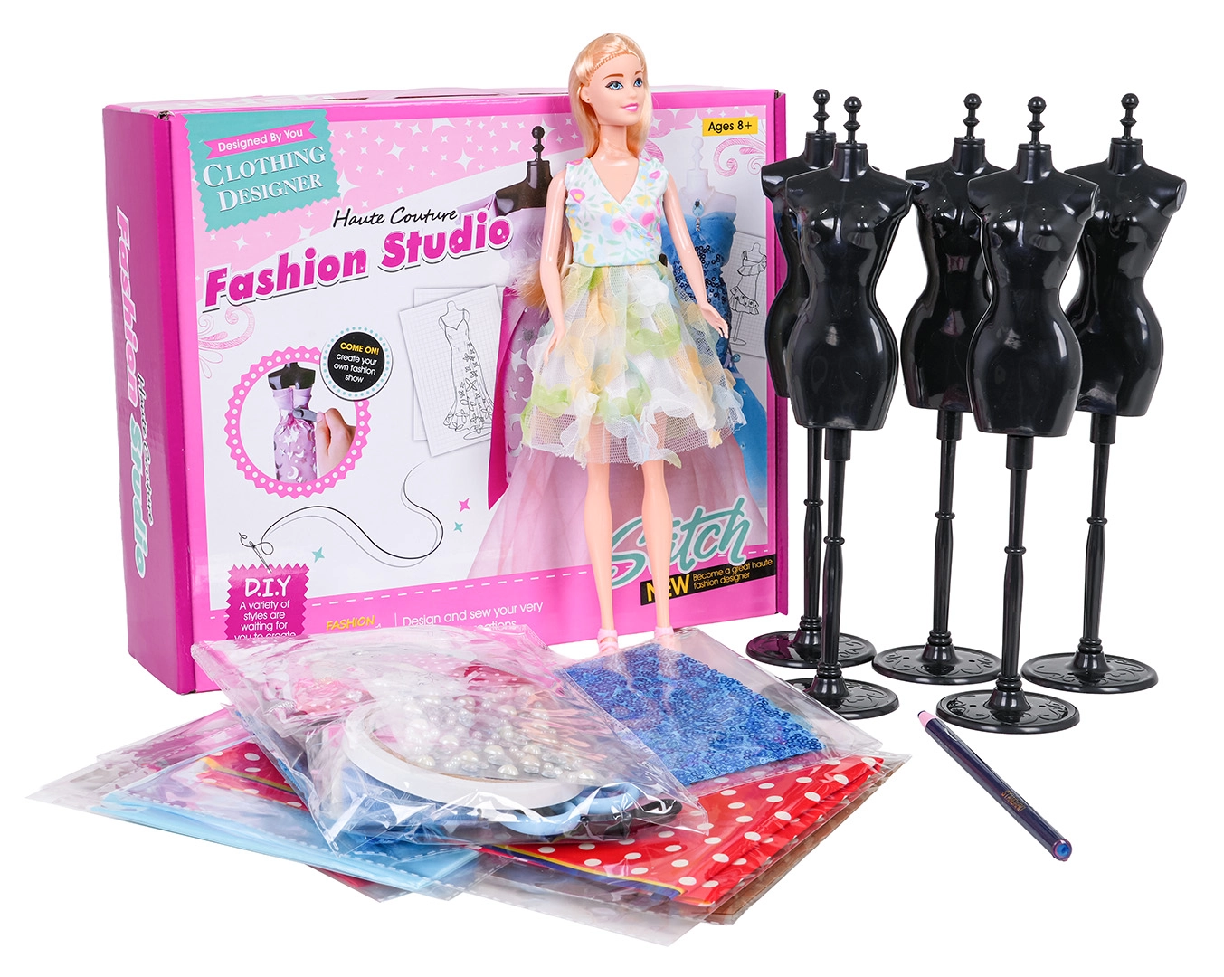 Ανακαλύψτε τη μαγεία της μόδας με αυτό το δημιουργικό σετ για μικρές σχεδιάστριες από 8 ετών. Το σετ περιλαμβάνει ό,τι χρειάζεστε για τον σχεδιασμό και το ράψιμο φορεμάτων για κούκλες: κούκλα, 5 μανεκέν, πολύχρωμα υφάσματα με χάρτινα πατρόν, ψαλίδι, κλωστές, κορδέλες, απλικέ, ταινία και βελόνες. Αναπτύσσει τη λεπτή κινητικότητα, την δημιουργικότητα και το αισθητικό κριτήριο – ιδανικό ως σετ δώρου.