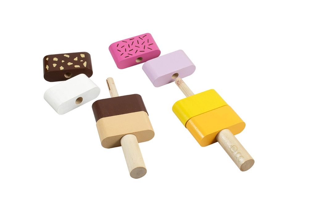Τα αποσπώμενα τμήματα επιτρέπουν οποιαδήποτε σειρά και συνδυασμό. Έτσι τα παιδιά εξασκούν εύκολα τη διάκριση χρωμάτων και τη δημιουργικότητα κατά την κατασκευή των παγωτών.