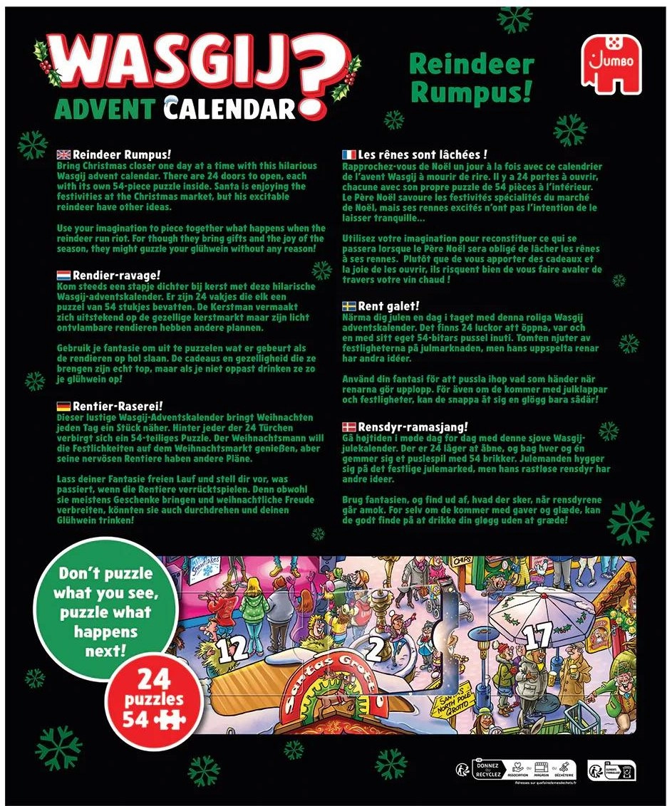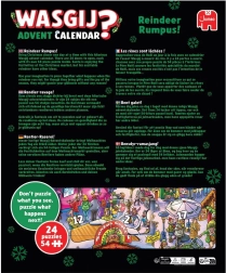 Κάντε την αναμονή για την Παραμονή των Χριστουγέννων ακόμη πιο διασκεδαστική με το ημερολόγιο WASGIJ: Αφηνιασμένοι τάρανδοι! Αυτό το ημερολόγιο προσφέρει μια μοναδική ιδέα, όπου το τελικό αποτέλεσμα δεν ταυτίζεται με την εικόνα στο κουτί. Αναζητάτε στοιχεία, ενεργοποιείτε τη φαντασία σας και συνθέτετε τη σκηνή από διαφορετική οπτική. Ιδανικό δώρο για φίλους των παζλ και έμπειρους puzzlers που θέλουν κάτι νέο.