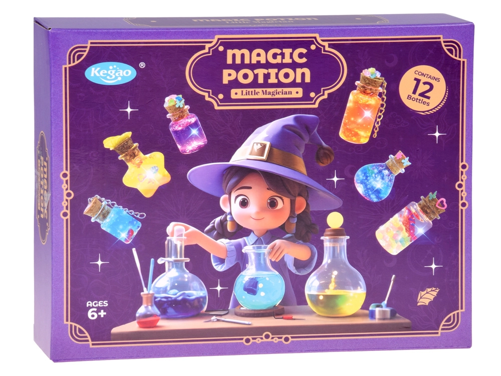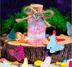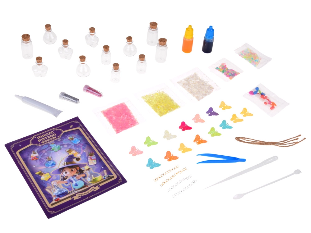 Ανακαλύψτε πόσο εύκολο και διασκεδαστικό είναι να δημιουργήσετε τα δικά σας διακοσμητικά φίλτρα! Αυτό το δημιουργικό σετ για παιδιά περιλαμβάνει μίνι γυάλινα μπουκαλάκια με φελλό, γκλίτερ, χρωστικές, διακοσμητικά σεκέν, μενταγιόν πεταλούδας και πρακτικά εργαλεία για ακριβή δοσομέτρηση. Τα παιδιά εξασκούν τη λεπτή κινητικότητα, την δημιουργικότητα και τη φαντασία τους αναμειγνύοντας χρώματα, γεμίζοντας και διακοσμώντας τα μαγικά ελιξίρια.