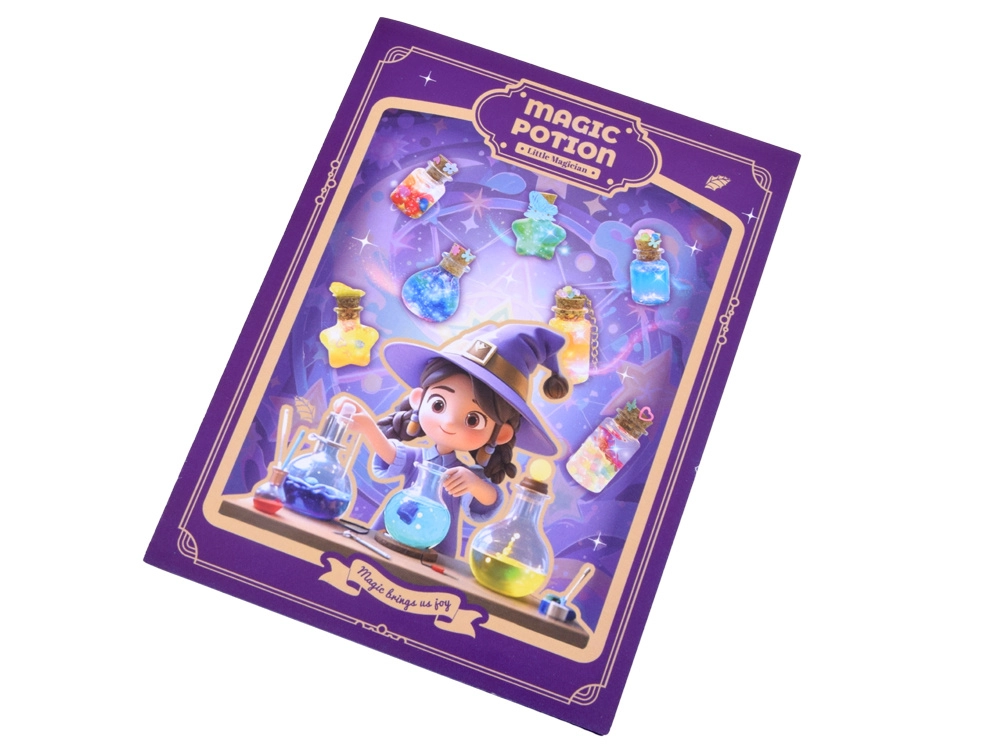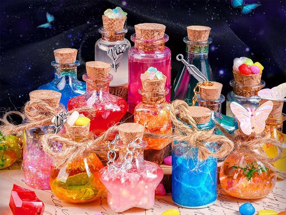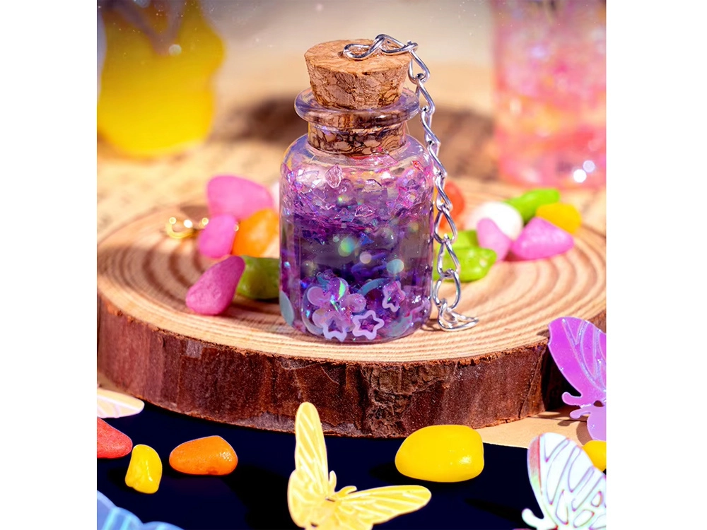 Το σετ για την κατασκευή “μαγικών φίλτρων” μετατρέπει κάθε ιδέα σε λαμπερό μίνι έργο. Αρκεί να ρίξετε γκλίτερ και διακοσμητικά στο μπουκαλάκι, να προσθέσετε νερό με χρωστική, να κλείσετε με φελλό και να στολίσετε με μενταγιόν. Το αποτέλεσμα μπορεί να γίνει μενταγιόν, φυλαχτό ή χαριτωμένη διακόσμηση για το δωμάτιο.